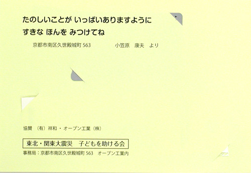 ガンジーの墓に刻まれている「7つの社会的罪」の中に、「理念なき政治」と「人間性なき科学」があることを知りました。 「理念」とは、「想像力をフル回転して他者の苦しみに寄り添う中から生まれるもの」 「人間性」とは、「命や子どもたちの将来を真剣に考えること」だと思います。 政治も科学も万能ではないですが、私は、力と富と心を結集し、「理念のある政治」と「人間性のある科学」を持ってすれば、世の中の9割以上の問題は解決できるのではないかと思っています。 そのために必要なのは、 政府・メディアは、「正確な情報を提供する勇気」 科学者は、「誤りに気づけば柔軟に方向転換する勇気」 一般市民は、「多くの情報の中から自分に出来ることを見つけ実行する勇気」 を持つことだと思います。 8週に一度執筆のブログ、今回は、「東北・関東大震災子どもを助ける会」を発足し、被災地の小学生に図書カードを送る支援をしている友人の活動をご紹介します。 詳細は、ブログ(http://kibounohon.blog.ocn.ne.jp/ →活動内容紹介)でご覧いただければ幸いです。下記にお送りいただいた図書カード(上記「ピーターラビット」1枚1000円)を、ブックマーカー(しおり)と共にセットし、取りまとめて被災地に届けています。 ■送り先■ 〒601-8205 京都市南区久世殿城町563 オープン工業(株)内 『東北・関東大震災 子どもを助ける会』 事務局 宛 子どもたちが、誰から貰ったのかが分かる方が人の温かみが伝わるとの現地からの要請で、台紙の裏面(下記)には支援いただいた方のお名前(会社名)・住所を印刷しますが、もしお名前を控えたい方は、「あしながおじさん」でも結構だそうです。既に3,000枚以上を送っていますが、最低年内は活動を続け、被災地の小学1年生5万人に届けることが当面の目標だそうです。 みなさん、既にいろいろな方法で支援をされていることと思いますが、こういう支援活動もある、という情報を紹介させて頂きました。ご協力、又この活動をお知り合いの方にご紹介いただければ幸いです。
