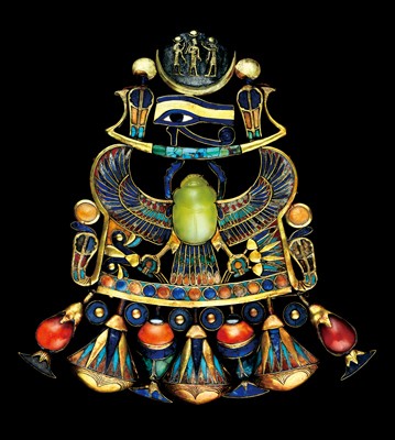 緑に輝く有翼のスカラベはフンコロガシと呼ばれるコガネムシの一種。隕石が地球に衝突した際に自然に形成された天然のガラスで作られ、復活する王を意味するそうだ。