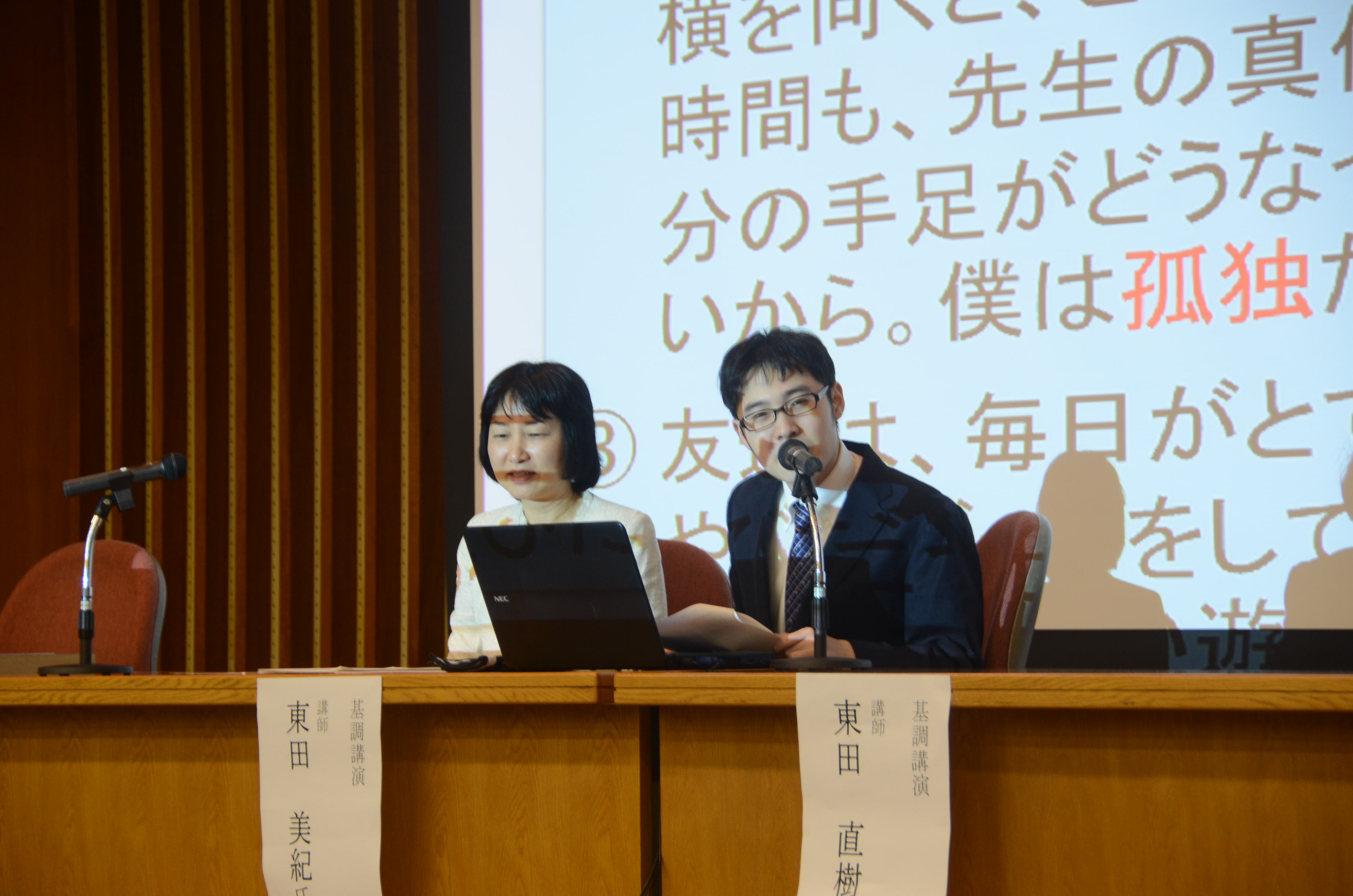 ▼藤沢育成会の職員全体研修で講演する東田直樹さんとお母様の美紀さん