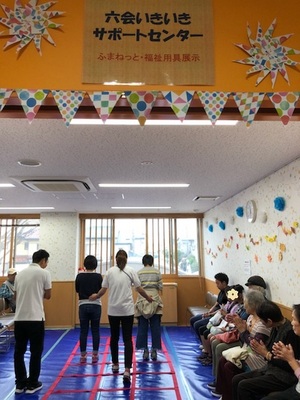 両日で140名の老若男女の方々より記入していただきました。そして、地域の方々へ介護予防活動のひとつとして、午前・午後と「ふまねっと」運動を行いました。大きなマス目の網を床に敷き、この網を踏まない様にゆっくり慎重に歩く運動です。色々なステップを間違えない様に「学習」しながら歩行のバランスを改善する「運動学習プログラム」です。足と手を使い、子どもから高齢者の方まで様々な年代の方に参加いただきました。普段出来ない運動が出来たと皆さんで大いに盛り上がりました!