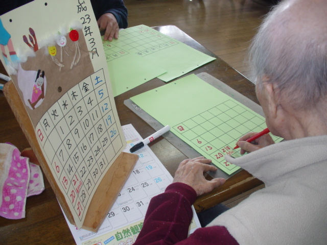 用意された専用画用紙に翌月の日付を書き込み(手先の運動と頭の体操を考慮)空いてるスペースへ四季折々の風物詩を用意されたパーツの貼り付けや、直に書き込んで、デザインを完成させる活動です。完成したカレンダーは、その日で持ち帰っています。