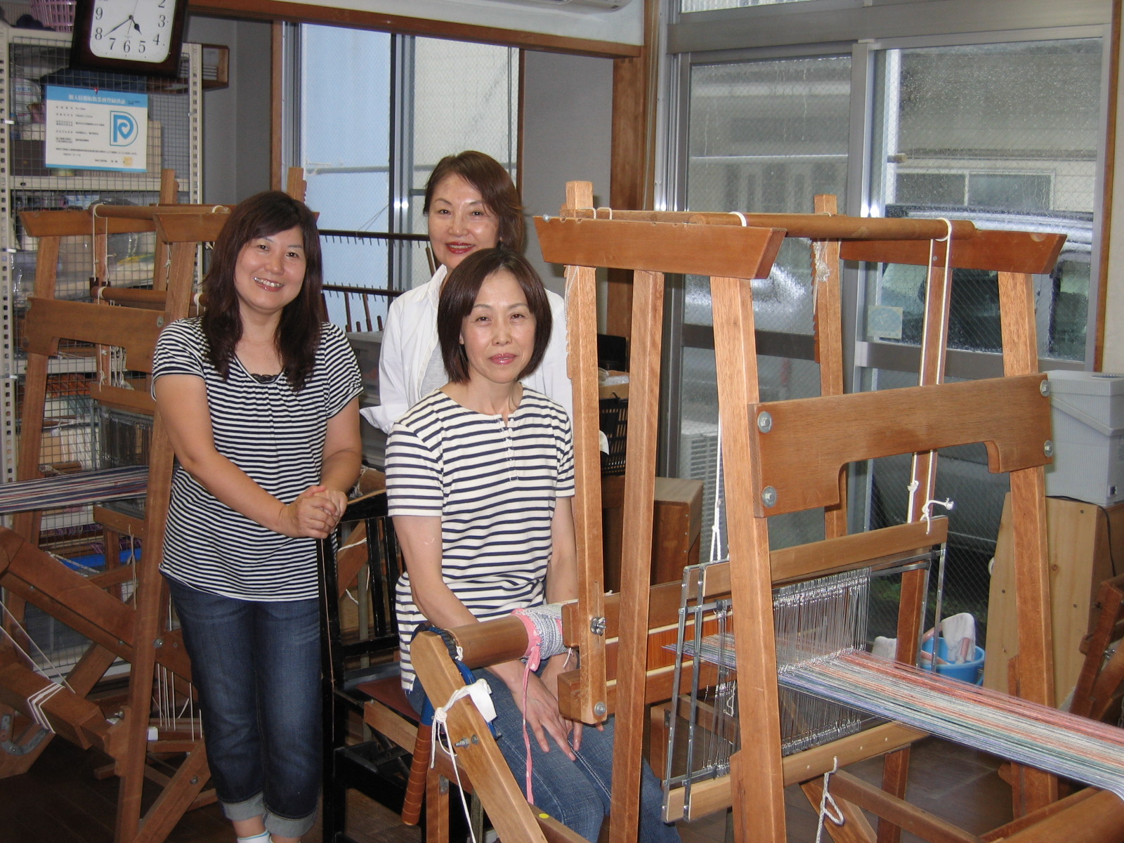 利用者さんは、織るだけでなく、すべての工程を3人の美人織姫(!?)と一緒にやっています。