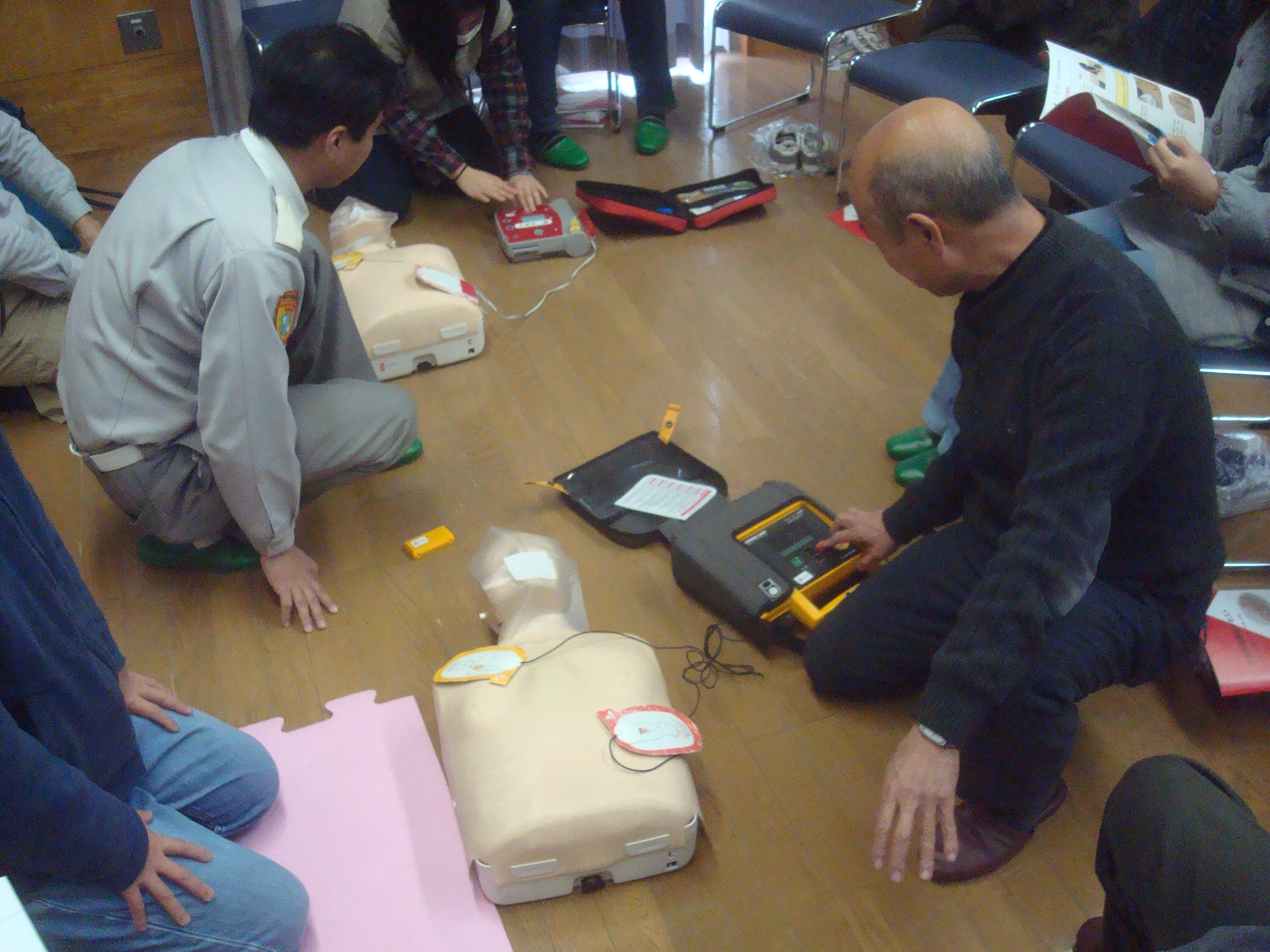 後半は8名程度を1グループとし7グループに分かれて、心肺蘇生法やAEDの使用方法を体験をとおして学びました。