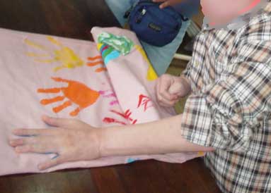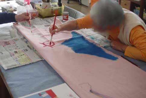 優しく可愛らしく表現した女性の方々、各曜日、普段物静かに過ごされている方が、大きな鯉のぼりに向かって、思い思いに絵や文字を描いていました。