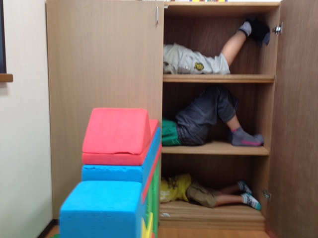 棚の中に3名と、カラーブロックの裏に1名が隠れていました。