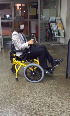 足こぎ車イスは皆でチャレンジしました。かっこいいデザインで小回りは利きますが坂がちょっと...。