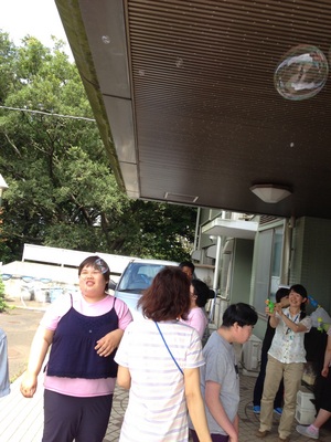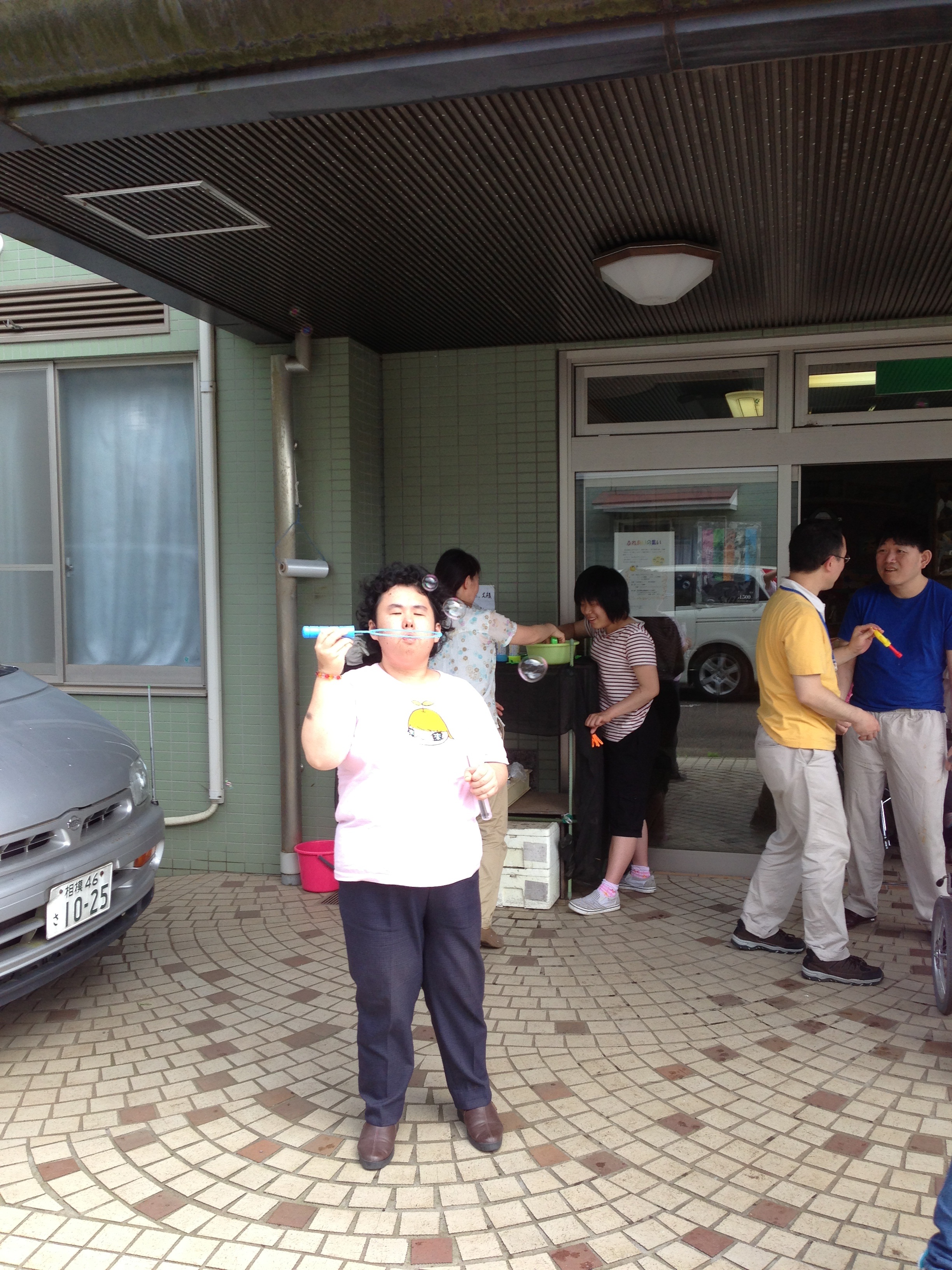 ここ最近、湘南ゆうき村ではシャボン玉遊びが流行っております。土曜利用日に天気もいいので外での遊びと思い照りつける太陽と共に遊ぶ利用者の姿が見られます。見てください弾ける笑顔!!何かのCMではないかと思わせます。飲料水メーカーからオファーがあったらどうしましょう。そうは言っても利用者さんだけが楽しいわけではなく、職員も楽しんでしまいました。