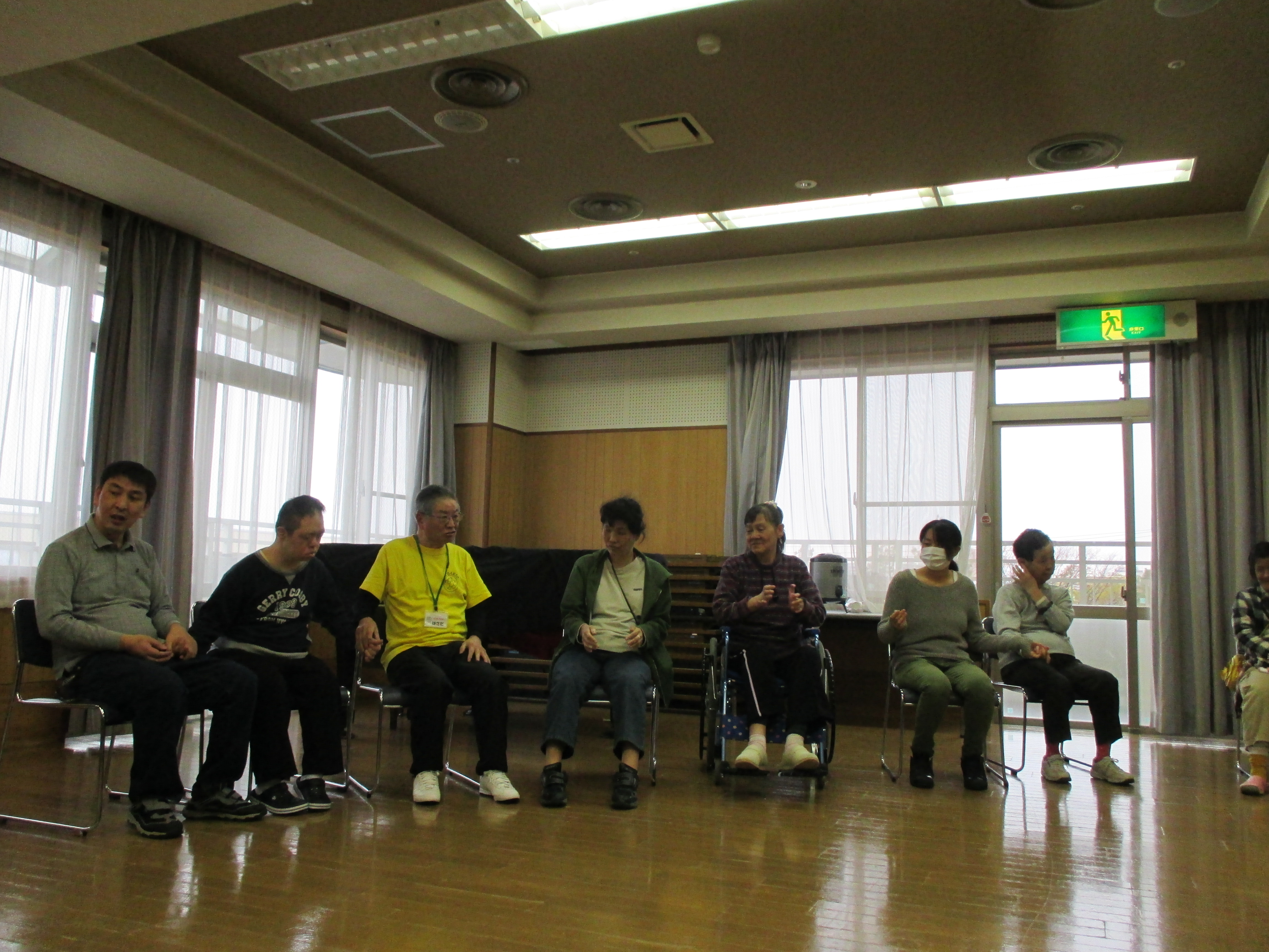 今回はいつも通り体操で体を動かすだけでなく、皆で椅子に座って歌や手遊びなども行ないました。椅子に座っての活動は今回が初めてでしたが、車椅子の方も、背の小さい方も、大きい方も・・・皆同じ目線で手と手・目と目を合わせて行なうことが出来、いつもよりも「みんなでやっている」という一体感が楽しめました。