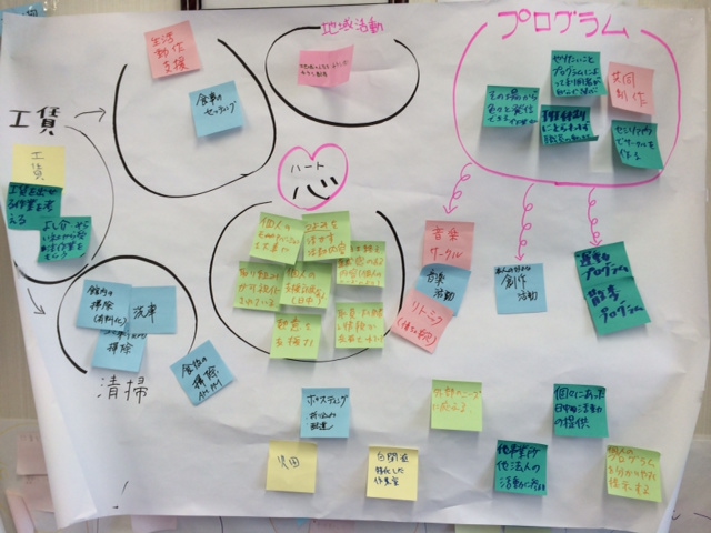 2月1日、湘南セシリアでは、1日職員研修を行いました。第1部は、「こんな作業班を目指したい」というテーマで、新年度の日中作業班の新体制編成に向けてグループワークを行いました。2グループに分かれ、現状の作業班で行っている成果や特質、今後日中活動で行いたい内容などをブレーンストーミング形式で自由に話し合い、成果の発表を行いました。