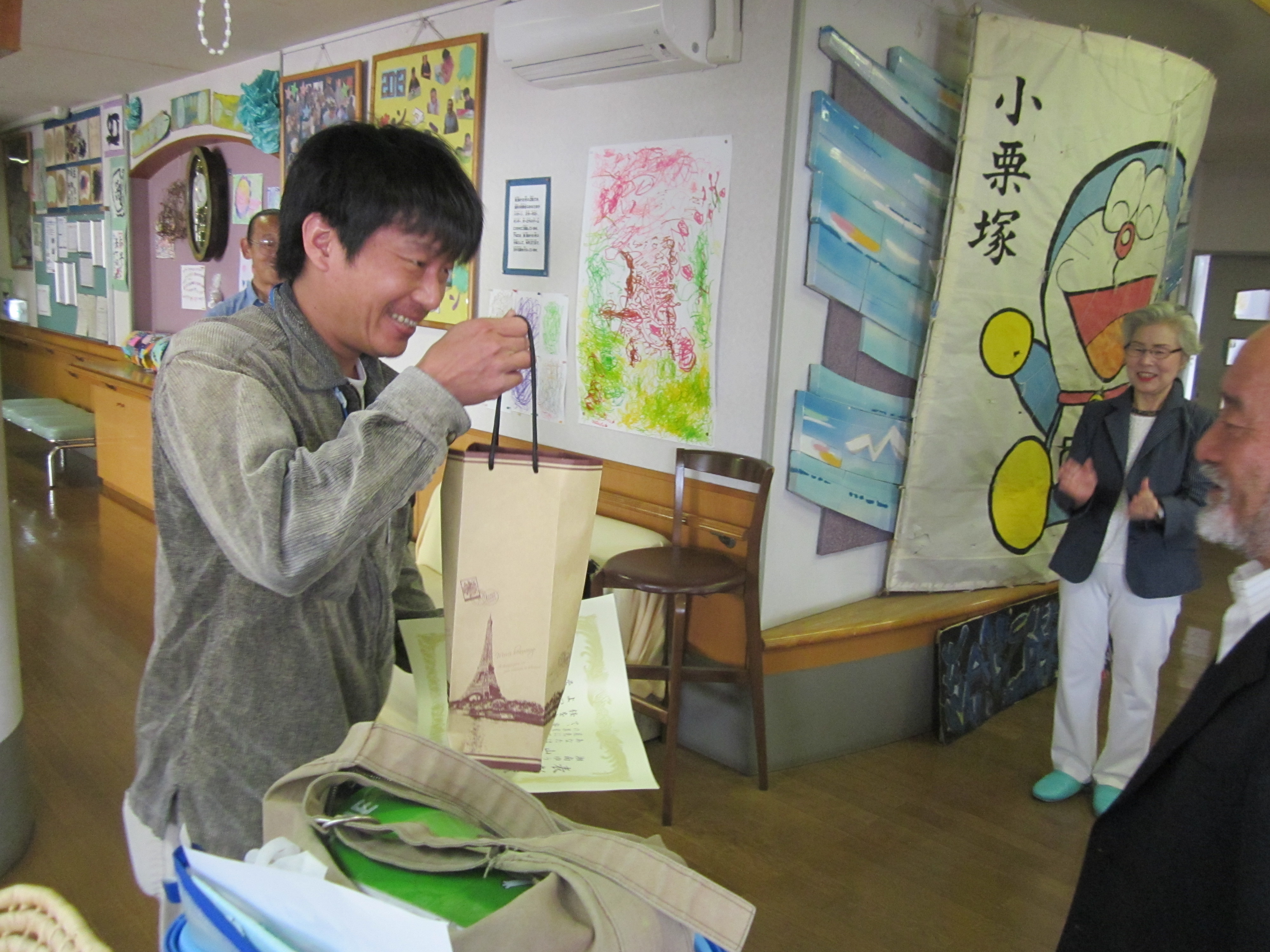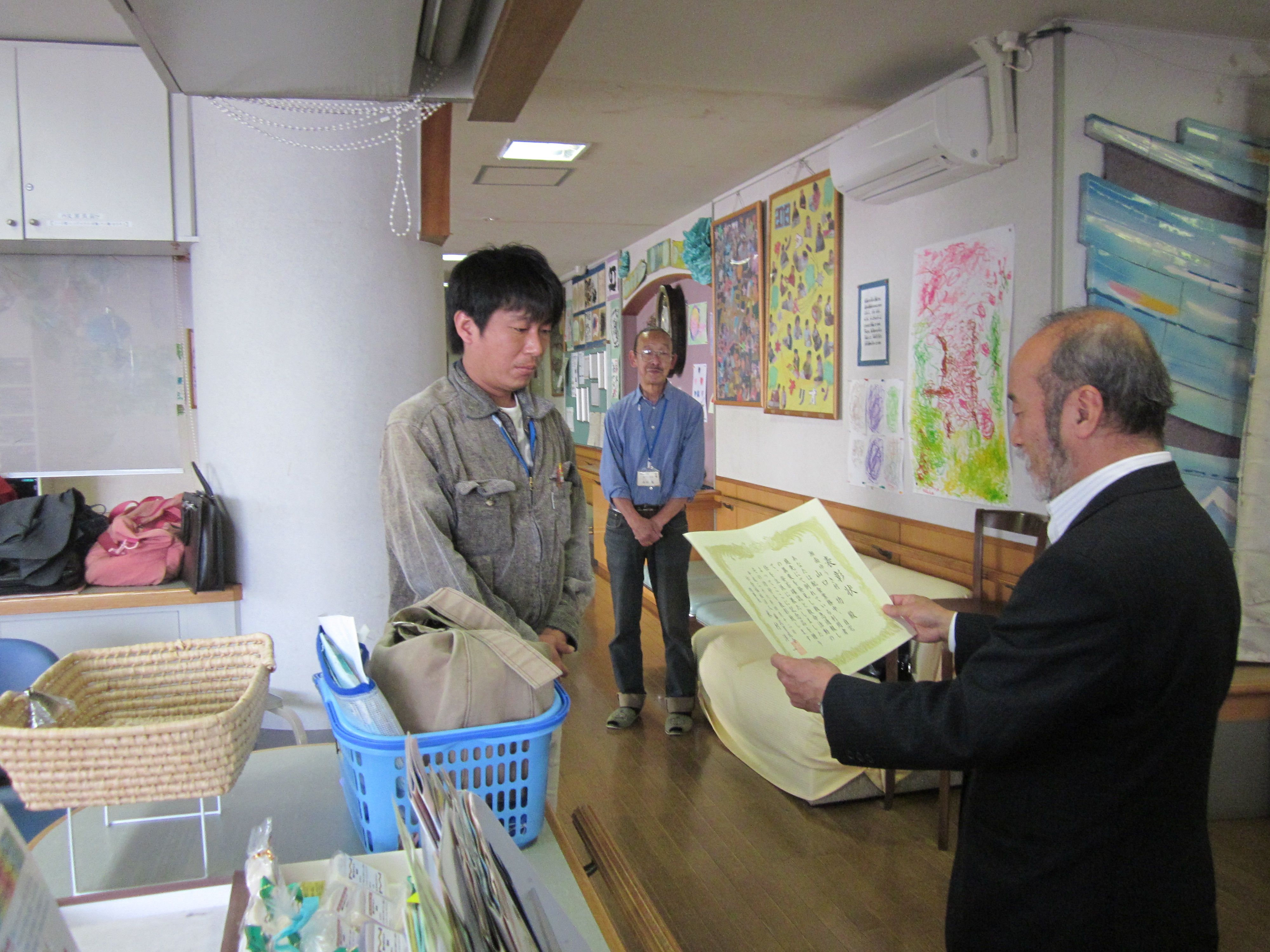 IMG_4008.JPG湘南ゆうき村から法人表彰者が出ました。理事長・専務理事・常務理事・施設長に囲まれて緊張の面持ちで受理されていました。当日まで本人には知らされてなかったので仕事を終えて帰るや否や!サプライズでした。おいしいワインの副賞に本人にんまりの笑顔でした。  土肥