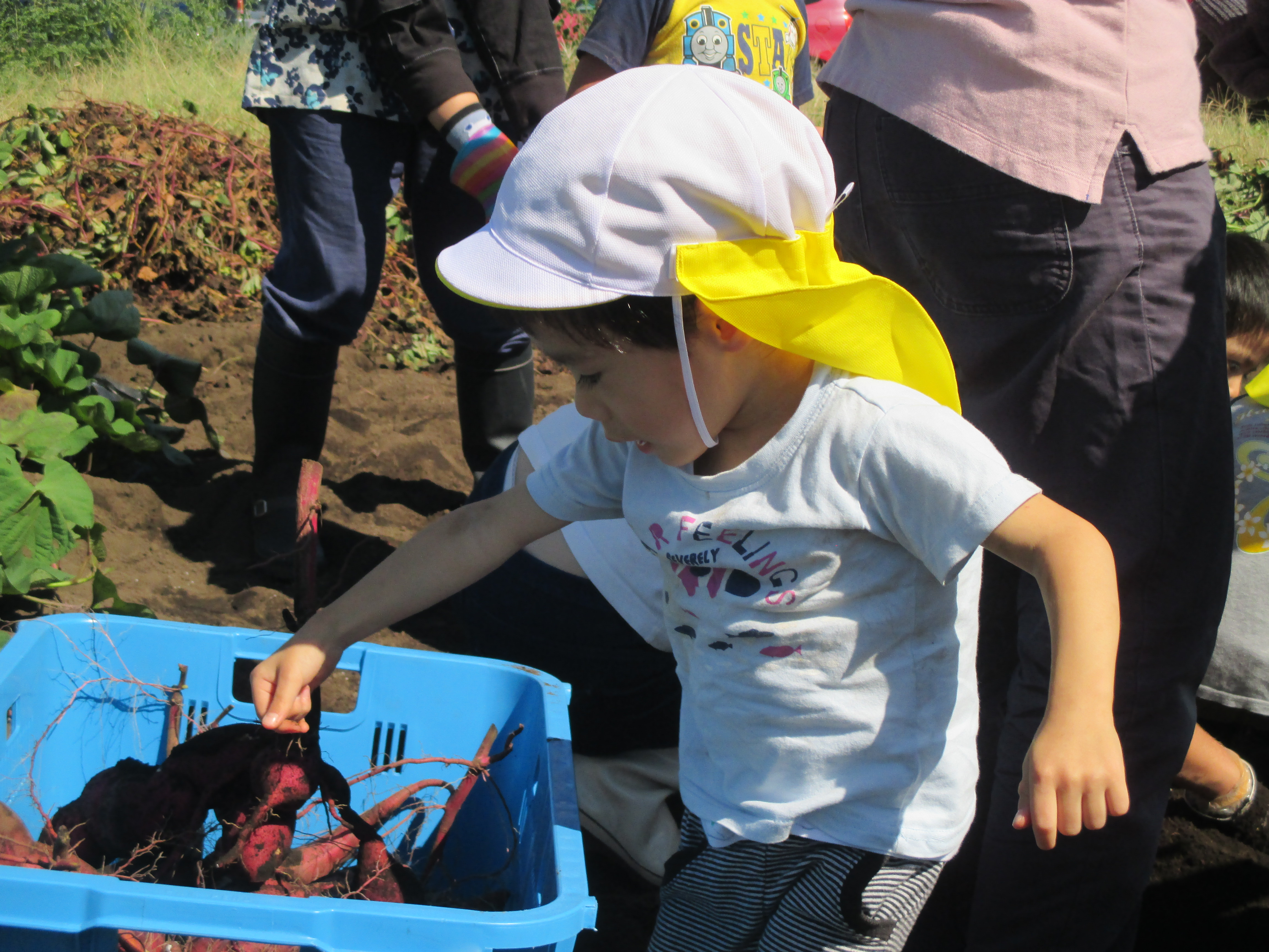 子どもたちは、土まみれになりながらお芋を掘ったり、せっせと運んだり、やわらかい土の感触を楽しんだりなどして、素敵な一日を過ごすことができました!