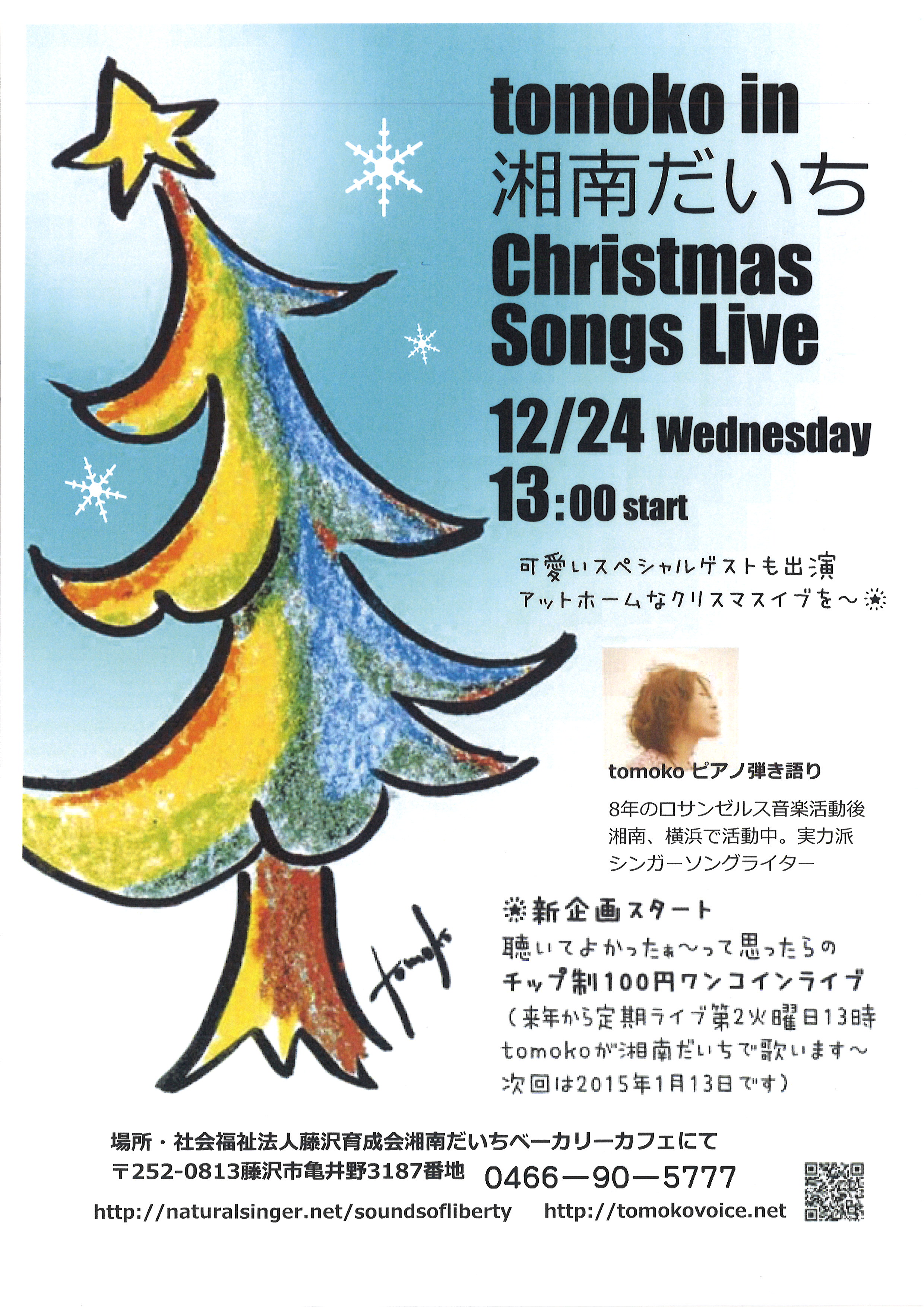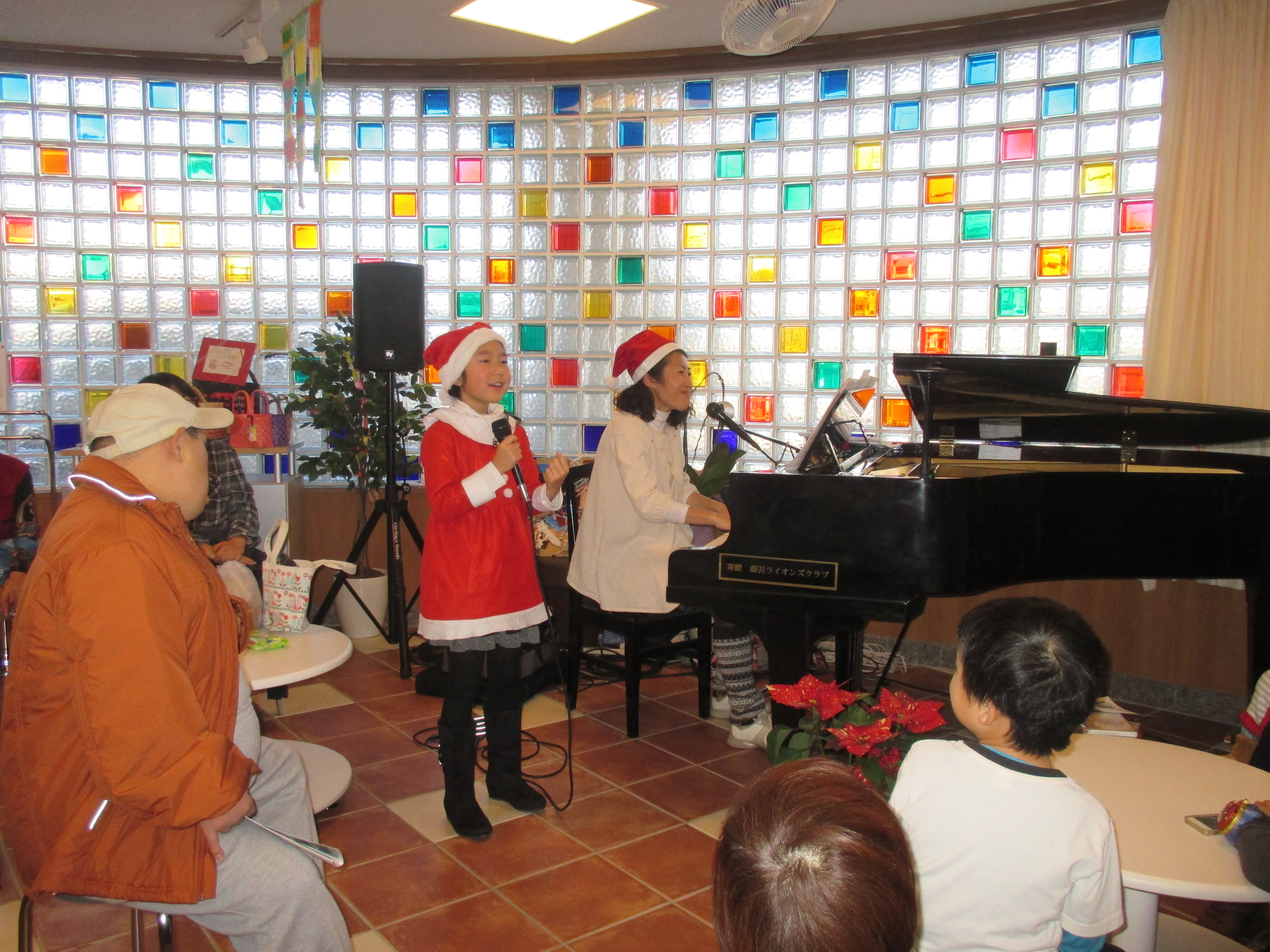 晴天恵まれた12月24日のイブの日に『だいちの森』のBGMでお馴染のシンガーソングライターのtomokoさん(参考URL:http://tomokovoice.net/)のChristmas Songs Liveを開催しました。 今回は智彩(ちさ)さんというとても可愛らしい未来のアーティストがスペシャルゲストとして登場してくださり、サンタの衣装に身を包み、Christmas song や Let It Go 等数曲を披露してくださいました。tomokoさんの選曲も季節感たっぷりでChristmasにふさわしい雰囲気の素敵な時間でした。