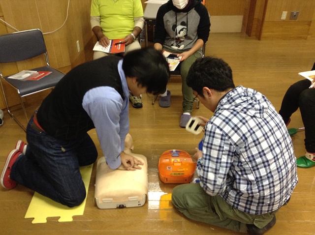 内容は、前半が消防署員による講義や視聴覚資料の講義など、後半は心肺蘇生法、AEDを用いての実技演習を行い、合計3時間の研修でした。