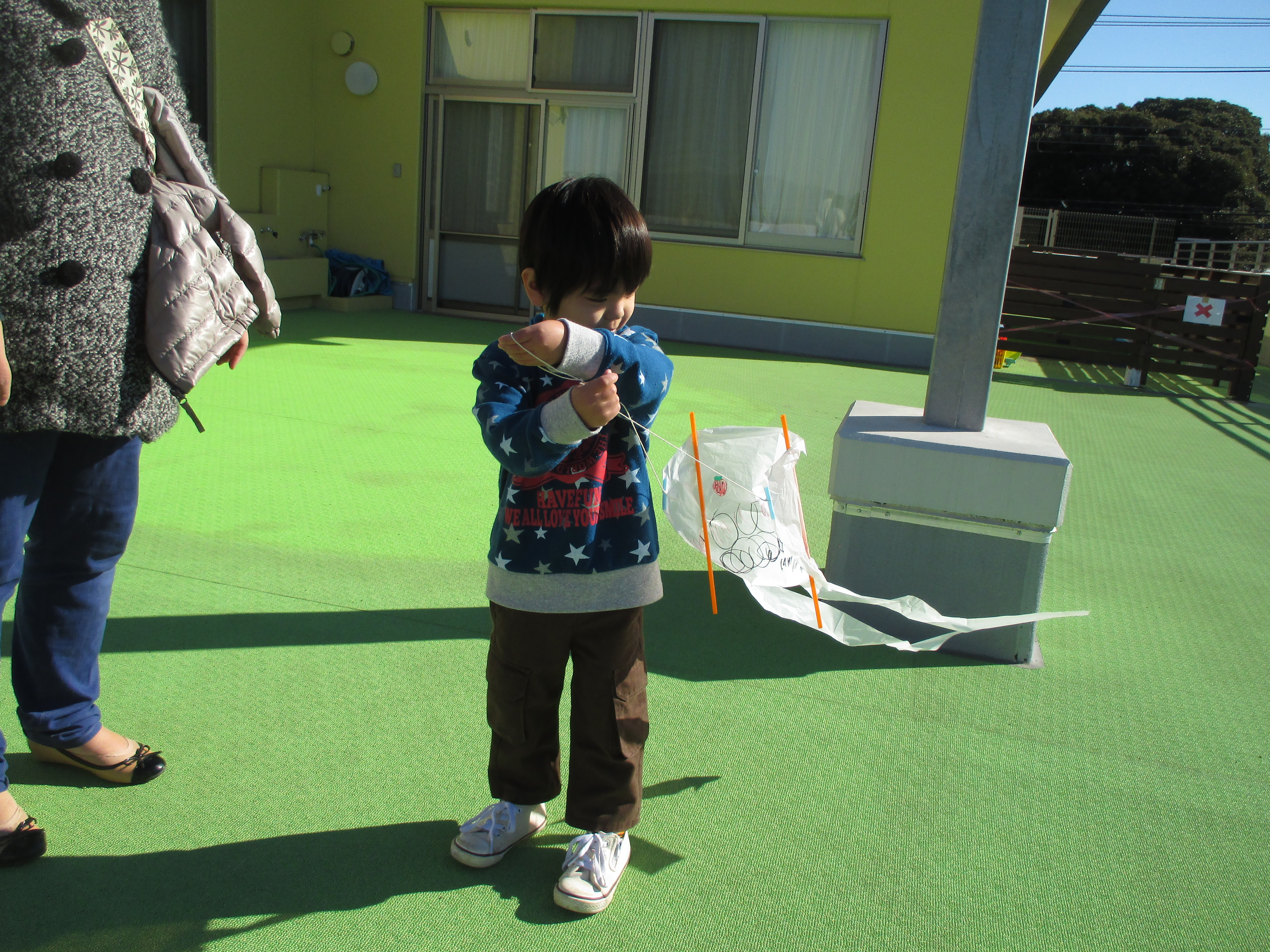 まずは、お父さんやお母さんと一緒に「凧づくり」をして、テラスで凧揚げをしました。