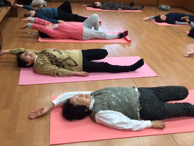 3月12日(木)、平成26年度介護予防事業『サロン元気』@六会も、最終回を迎えました。この日の活動は、1年間を通じて中心に取り組んできた「ヨガ教室」の総まとめ。ゆったりとしたBGMを聴きながら、無理せず、自分のペースで行うことが基本です。講師は茅ヶ崎を中心に活躍中の早川悠紀先生。「ヨガで大切なことは呼吸法。吐くときはお腹をへこまして息を吐ききり、吸う時はお腹を膨らます。最初はできなくても、お腹に意識を向けて続ければ必ずできるようになります」(早川先生)。
