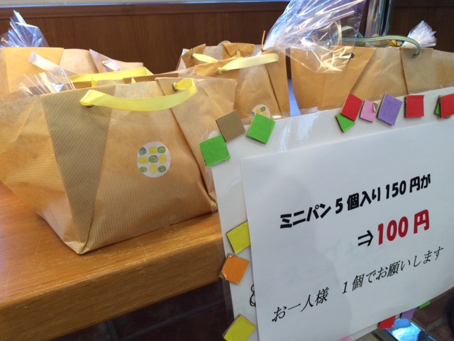 今回の目玉商品はミニパンシリーズの詰め合わせ(150円→100円)を限定10個販売。ちなみに、パンを詰めた'袋'は【やまぶき】の部屋で利用者さんが作ってくださいました。