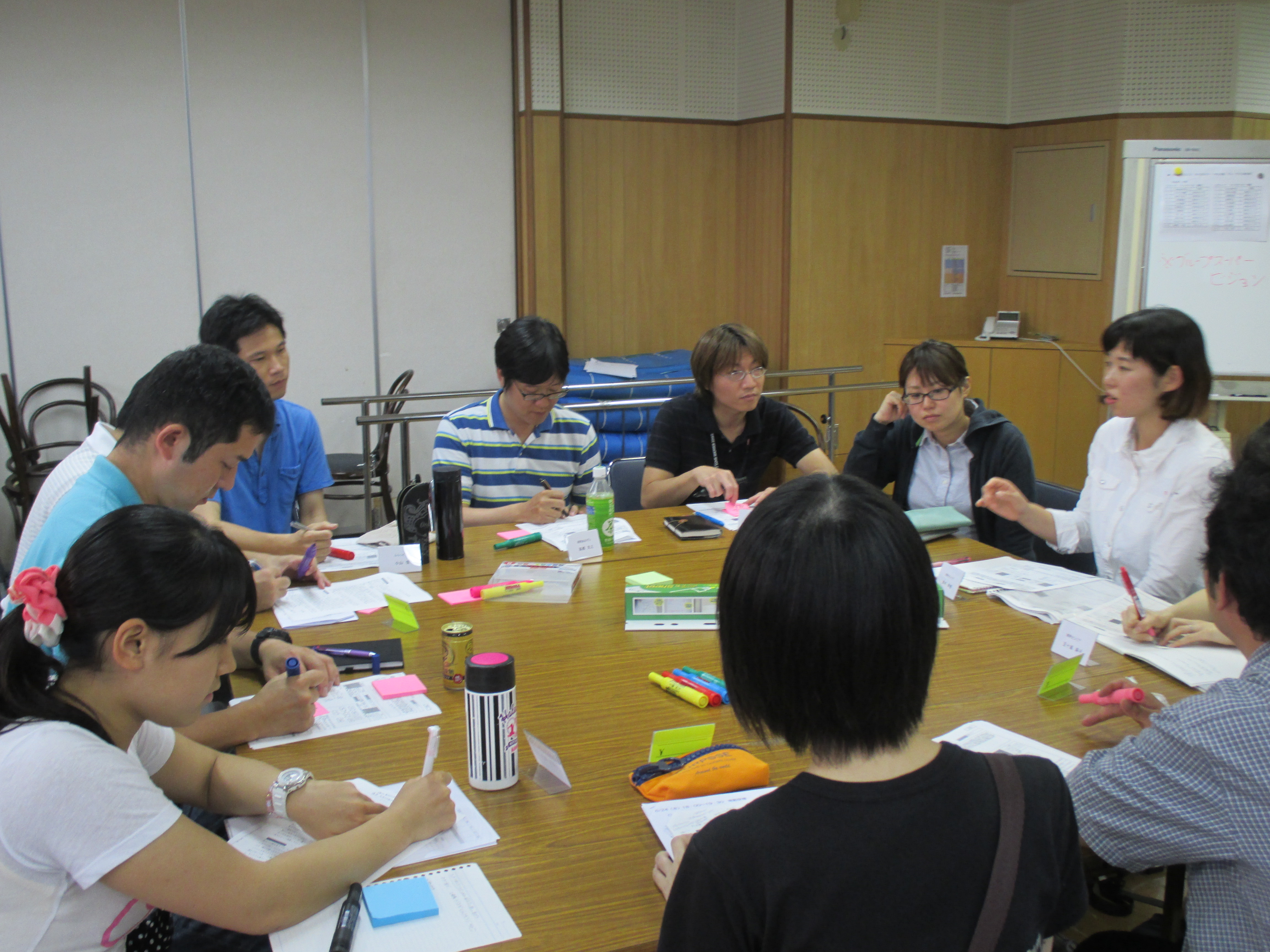 また、昨年度「地域を考えるプロジェクト」に参加したメンバーが率先して「アイディア出し」を行ってもらったことも、初めて参加する職員にとって、良い刺激になったようです。当日の参加者は21名の常勤A職員。2つのグループに分けて湘南セシリア・湘南あおぞらが出した地域移行にむけた「ケース」について、下記のグループスーパービジョンの流れで行いました。