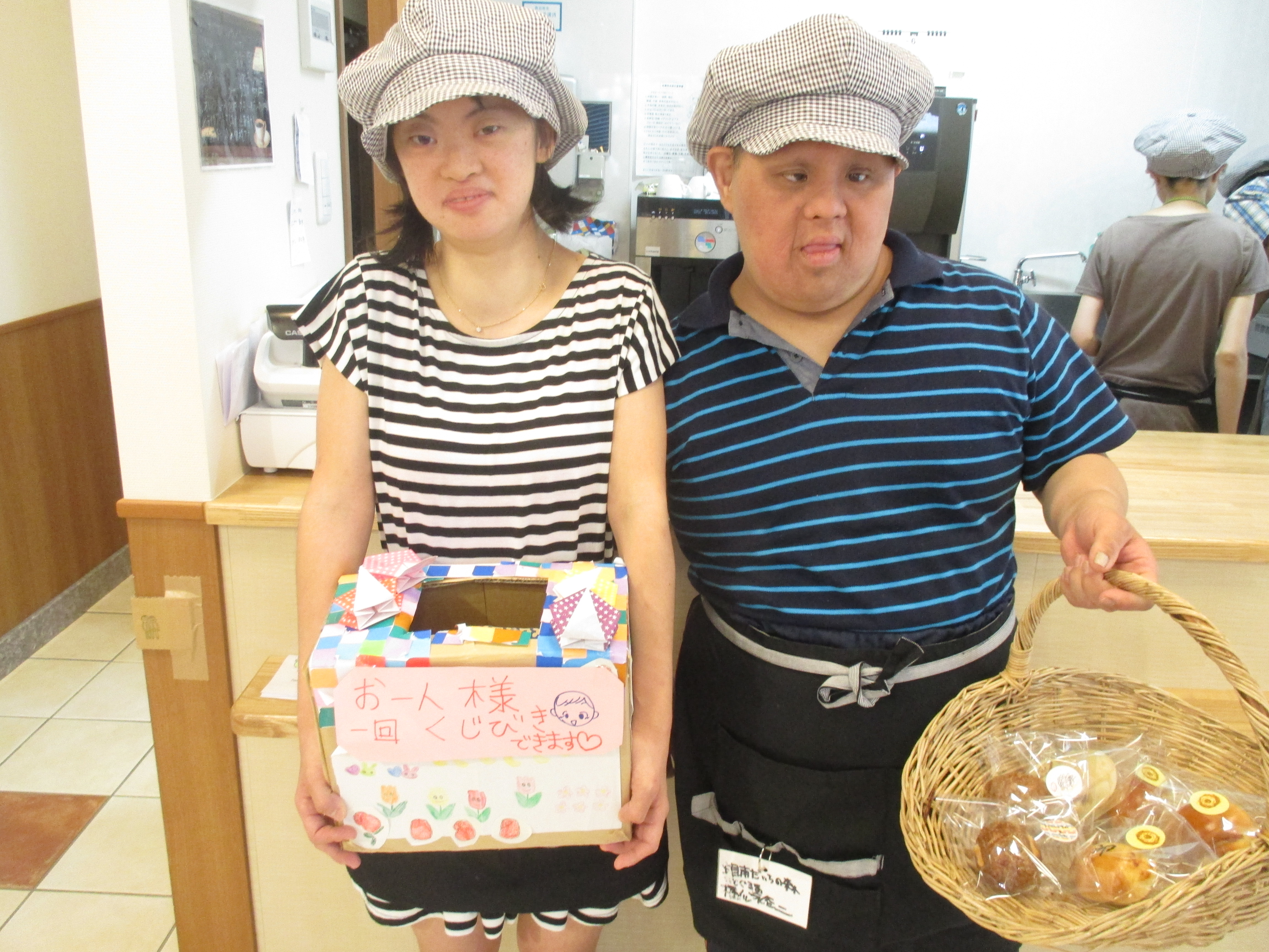 今回は、①パン100円コーナー②ミニパンがあたるくじ引きの二本立てでした。特に喜ばれたのが、くじ引きです。利用者さんの味のある文字で書かれた【あたり】【はずれ】のくじを見て、一喜一憂されるお客様の様子がありました。