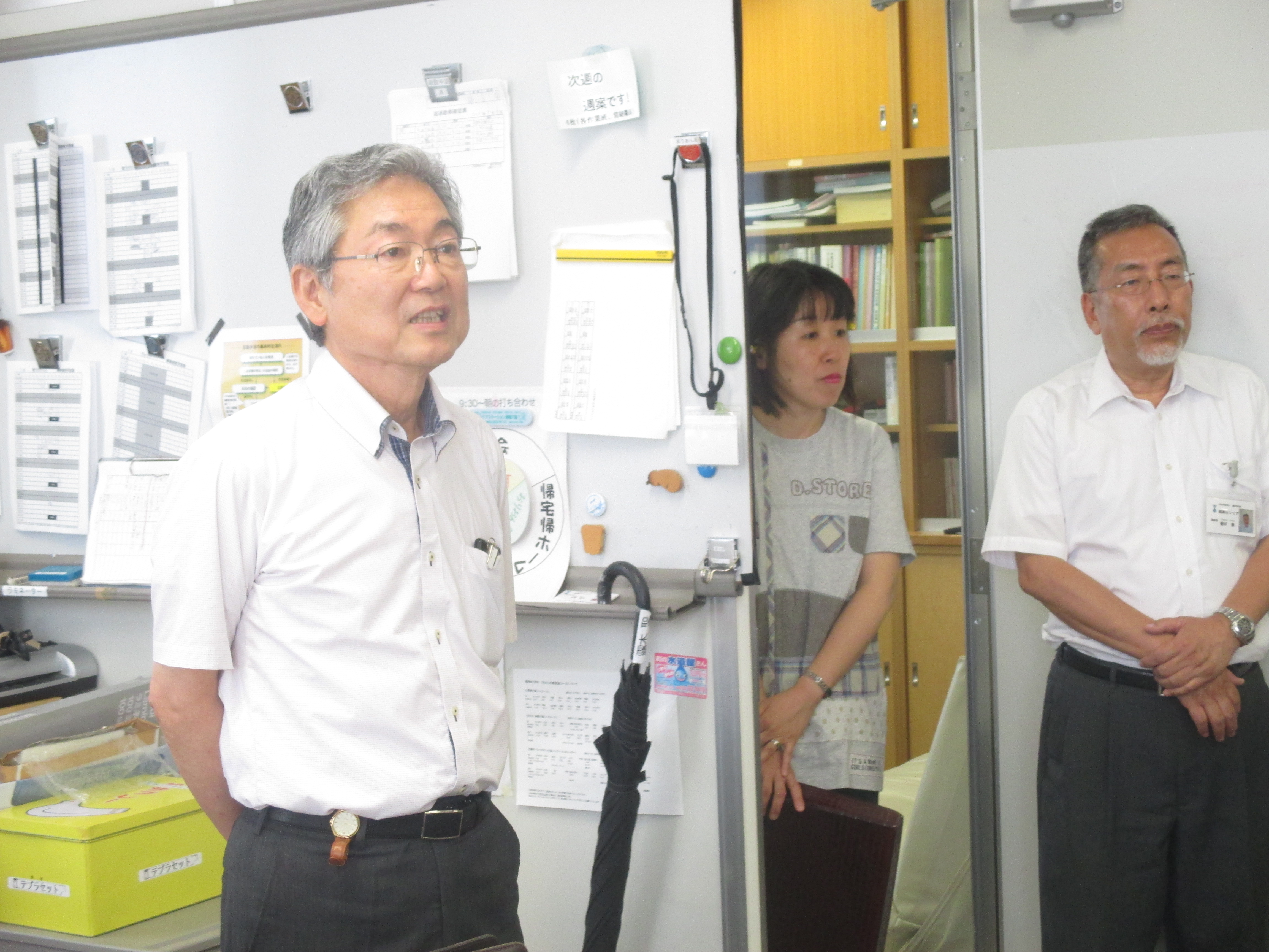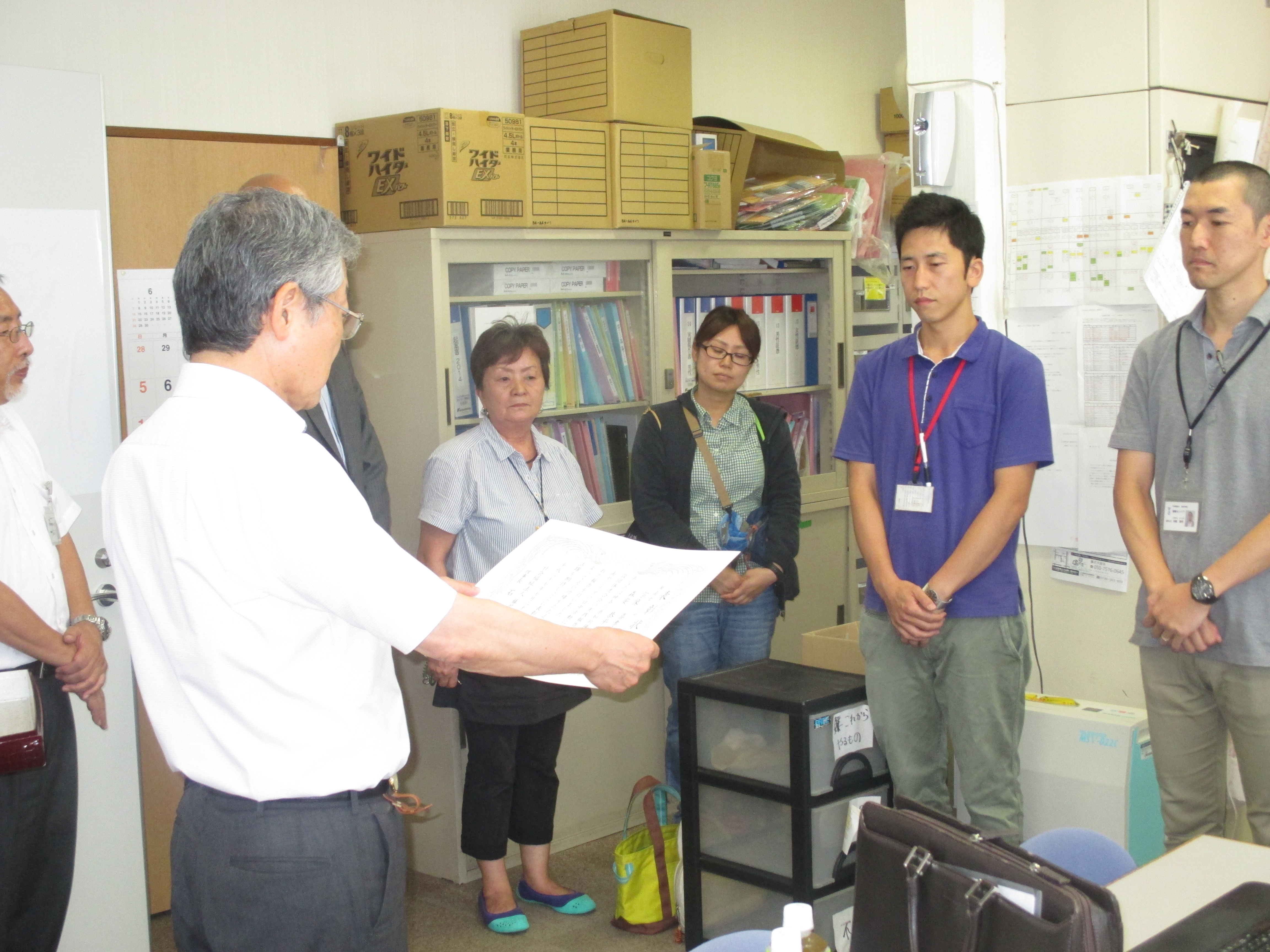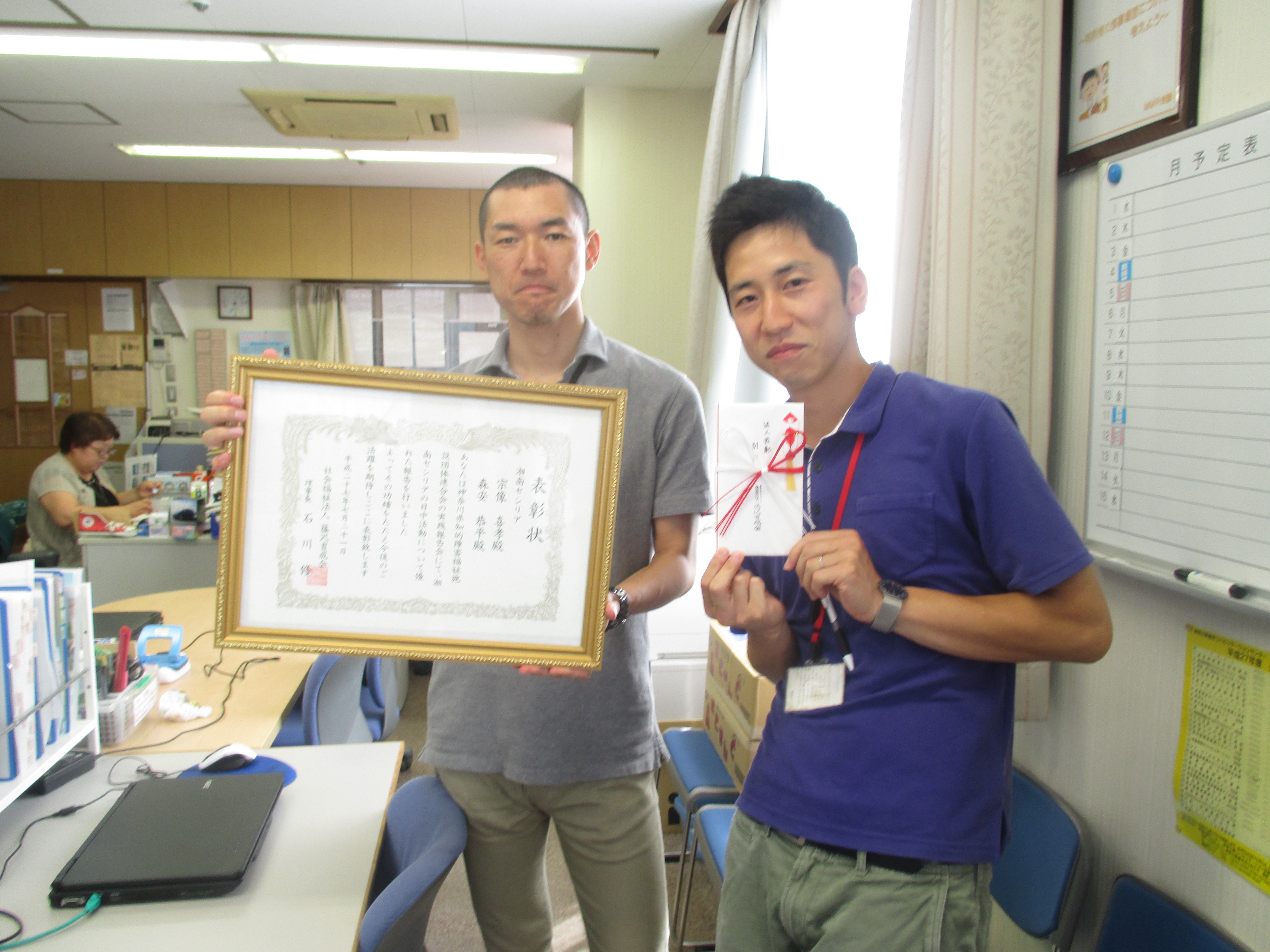 当日、石川理事長・倉重常務理事が来所して、表彰式をセシリアの事務所で行いました。表彰状を受け取った宗像主任は、「自分たちが行っている実践や、藤沢育成会を県の大会で久しぶりに伝える機会をあたえて頂き、とても光栄でした。今後もこの経験を大事にして仕事を進めていきたいと思います。」と感想を話してくれました。![]()