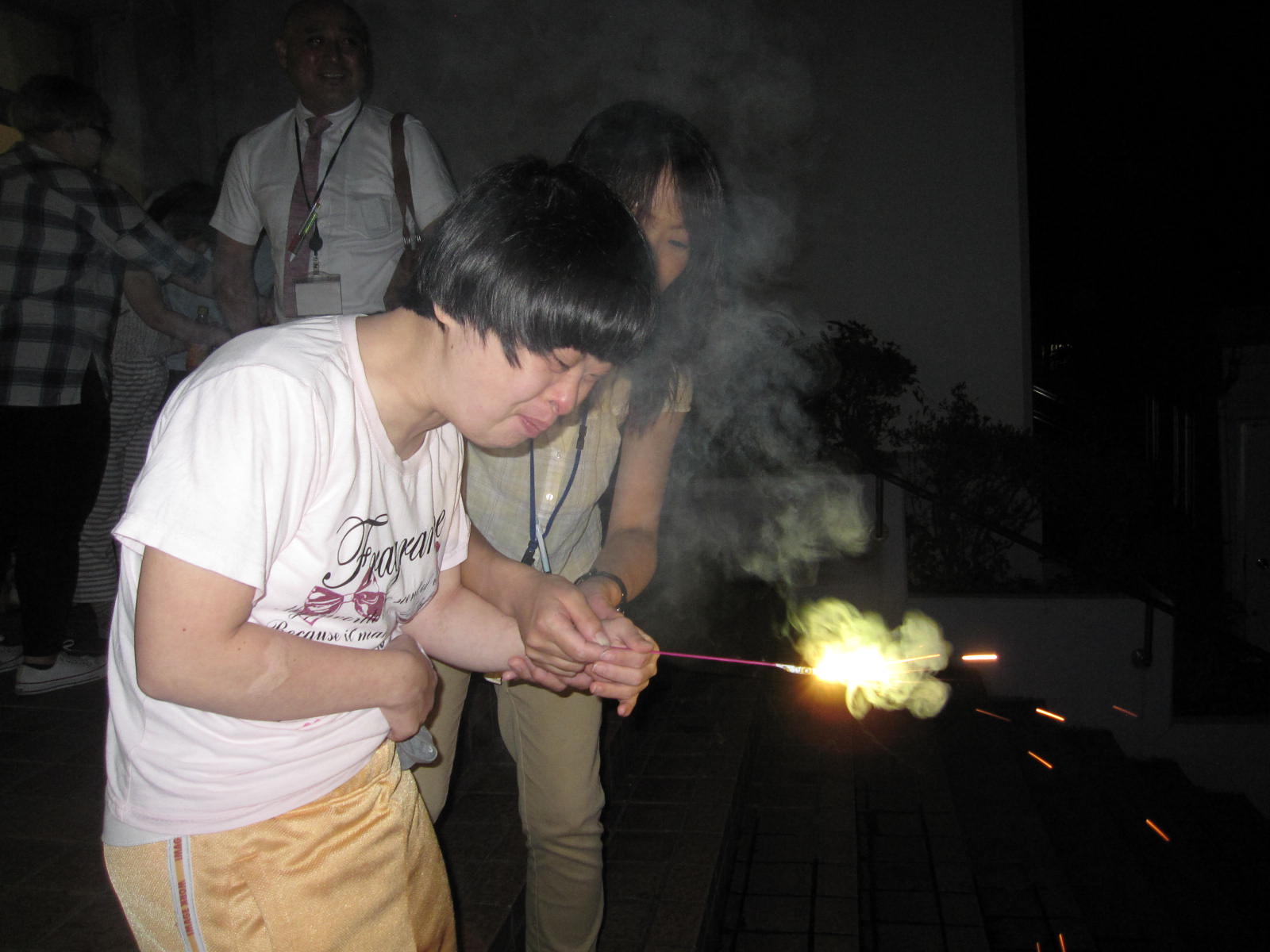 まずは、自分の好きなジュースを飲みながら花火を鑑賞し、その後は手持ち花火で大盛り上がり。近くに寄るのはこわいけど、「きれい」と喜んで観ている方、花火や煙を追いかけて走り回って観る方、男性職員としっとりと手持ち花火を楽しむ方などそれぞれの楽しみ方で楽しみました!!