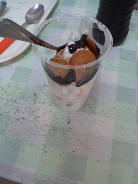 フルーツ缶、ヨーグルト、ホイップクリーム、クッキー、チョコソースを使ってそれぞれがカップに盛り付け、美味しくいただきました。皆さん顔にクリームをつけつつ楽しまれていました。