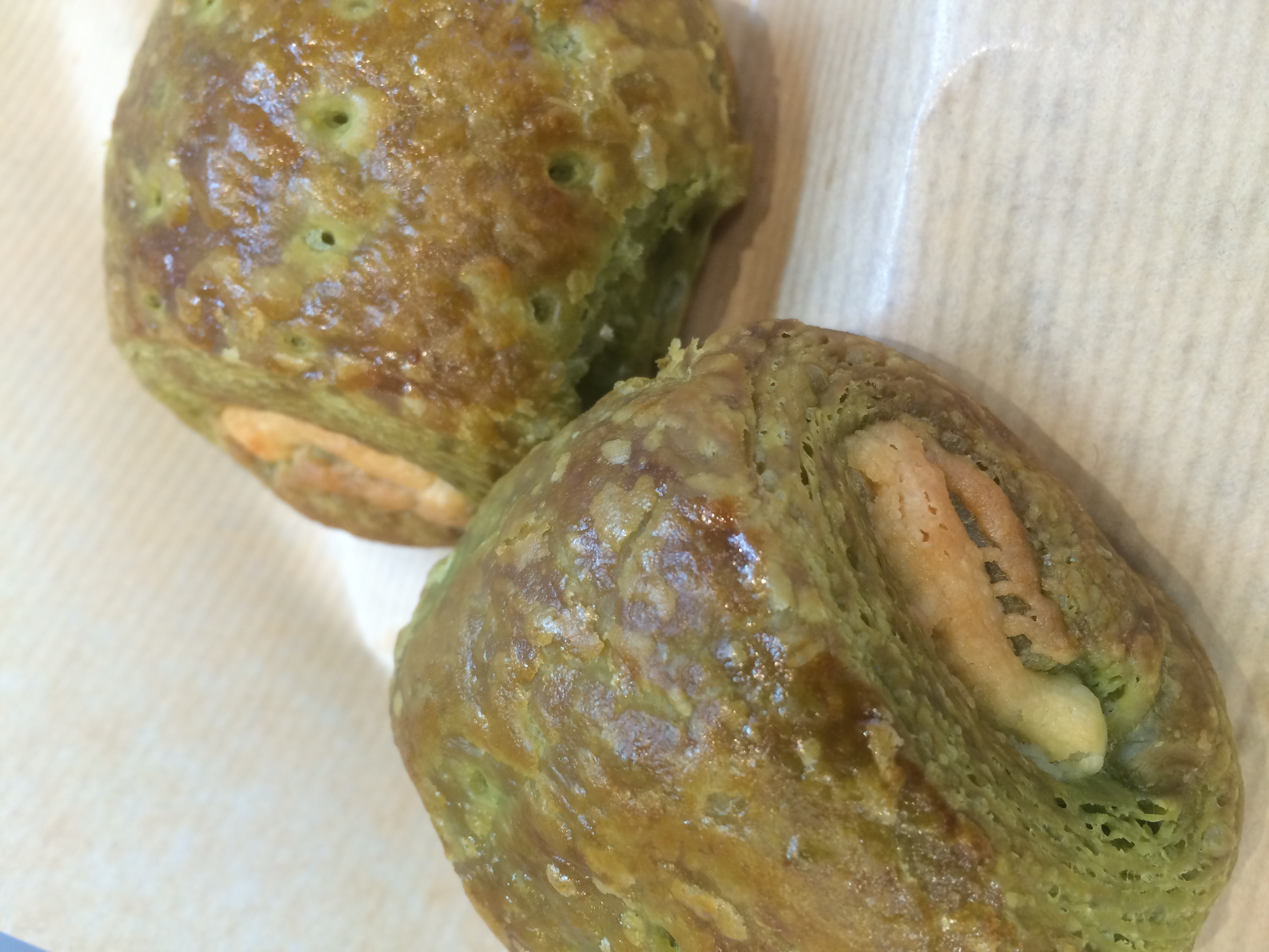 人気のミニパン・オ・ショコラの抹茶バージョン。抹茶の生地でホワイトチョコクリームを包んでいます。コーヒー・紅茶・日本茶、どれにも合いますヨ✩✩✩