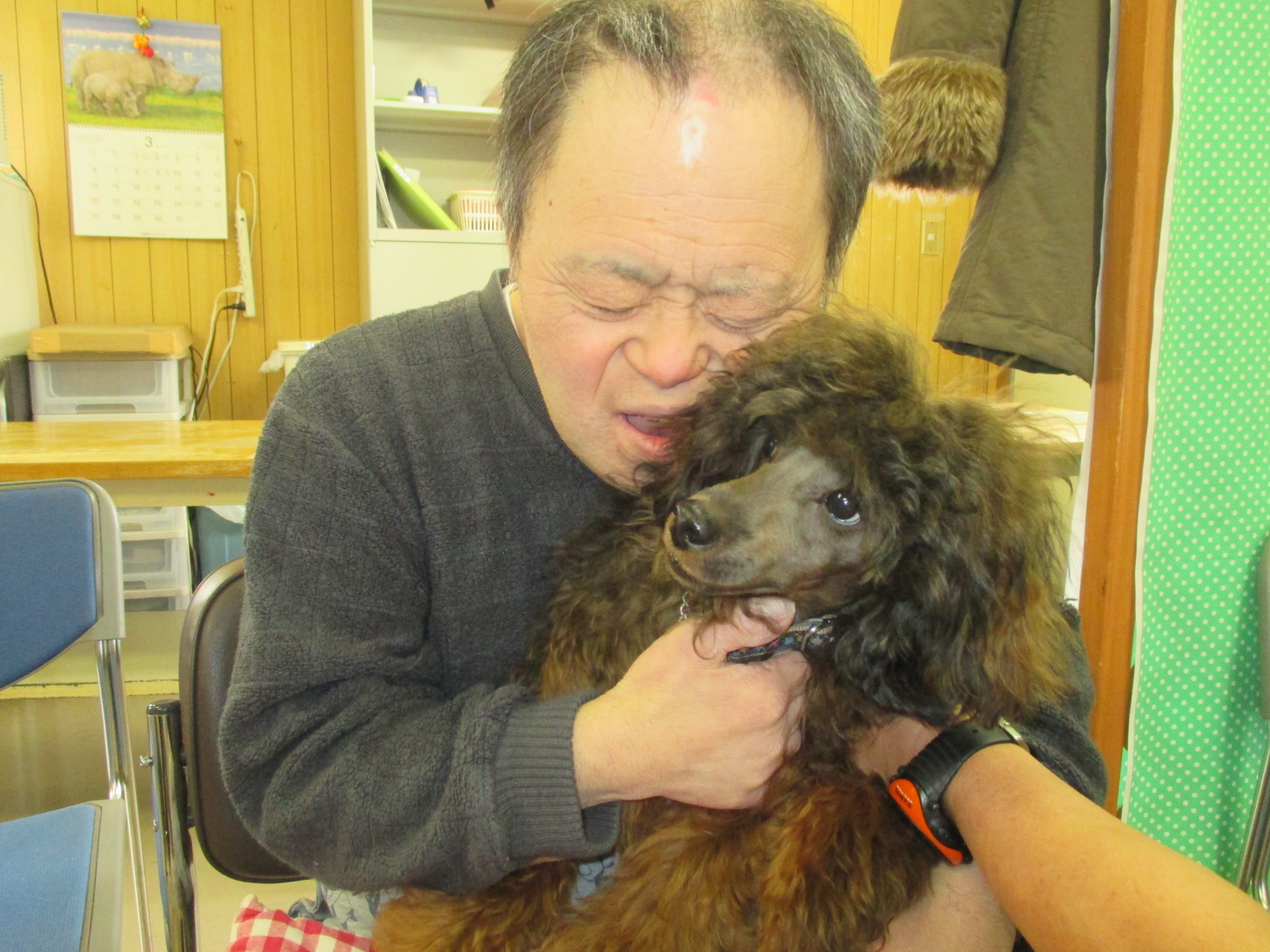 最初、利用者の方々は、作業室に待機していた犬に驚く方がいましたが徐々にふれあうことで、皆さん笑顔が多くなってきました。