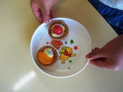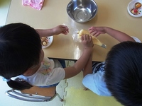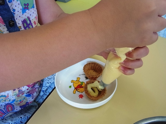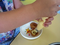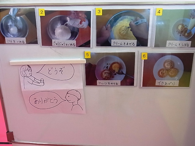 写真手順を見ながら順番に牛乳を計る、クリームを混ぜる、しぼる、トッピングをする等を行ないました。みんなでつくると美味しいですね。あっという間に「ごちそうさま」となりました!