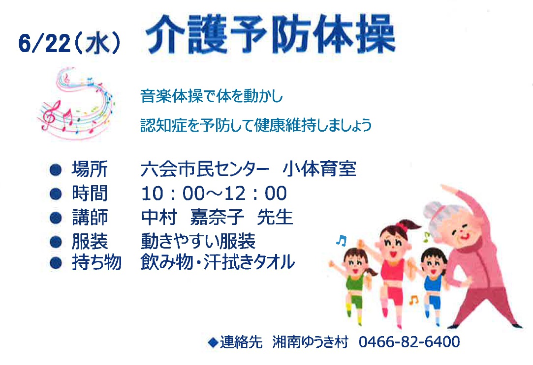 次回は、6月22日(水)10:00~ 介護予防体操です。