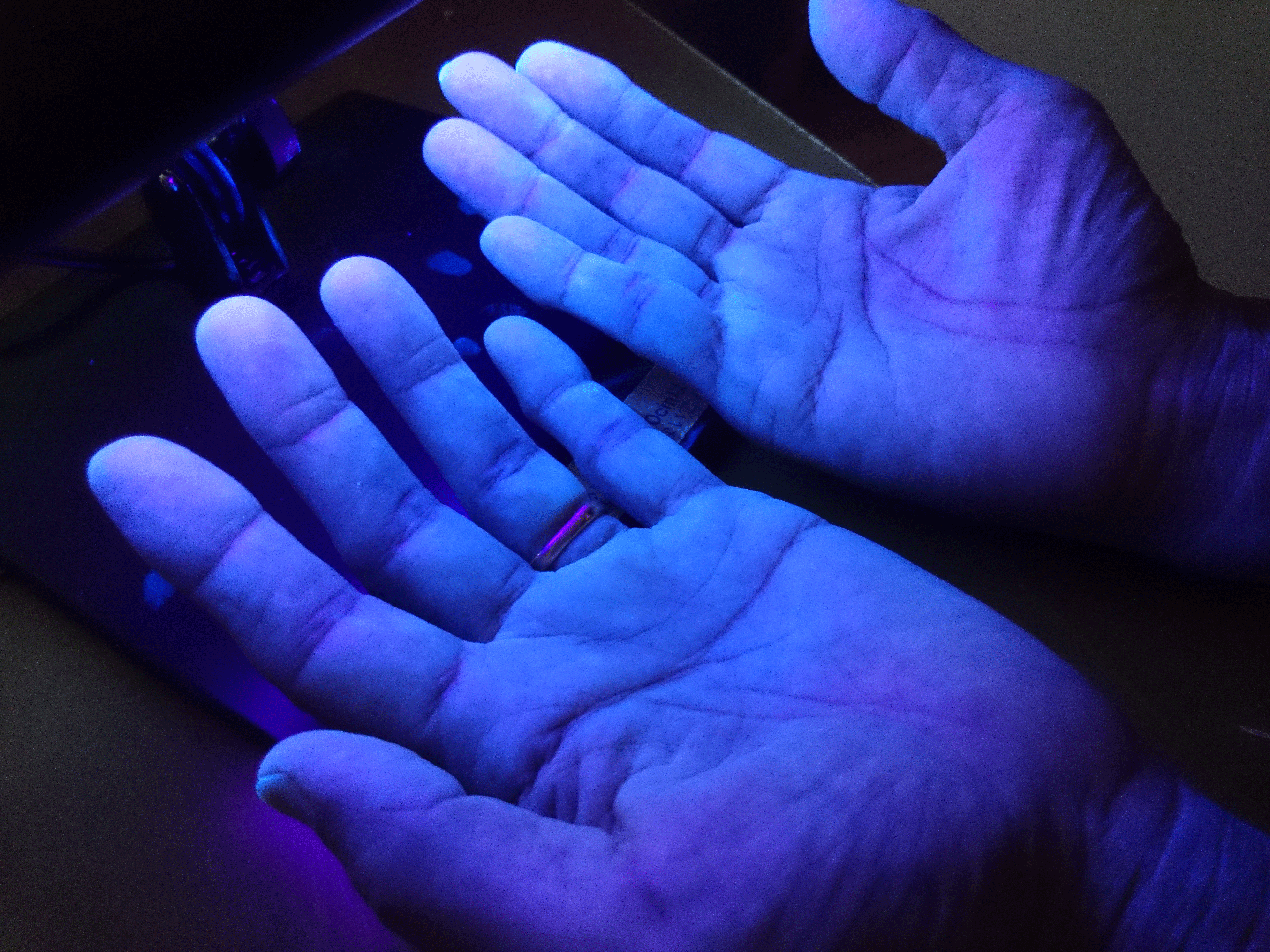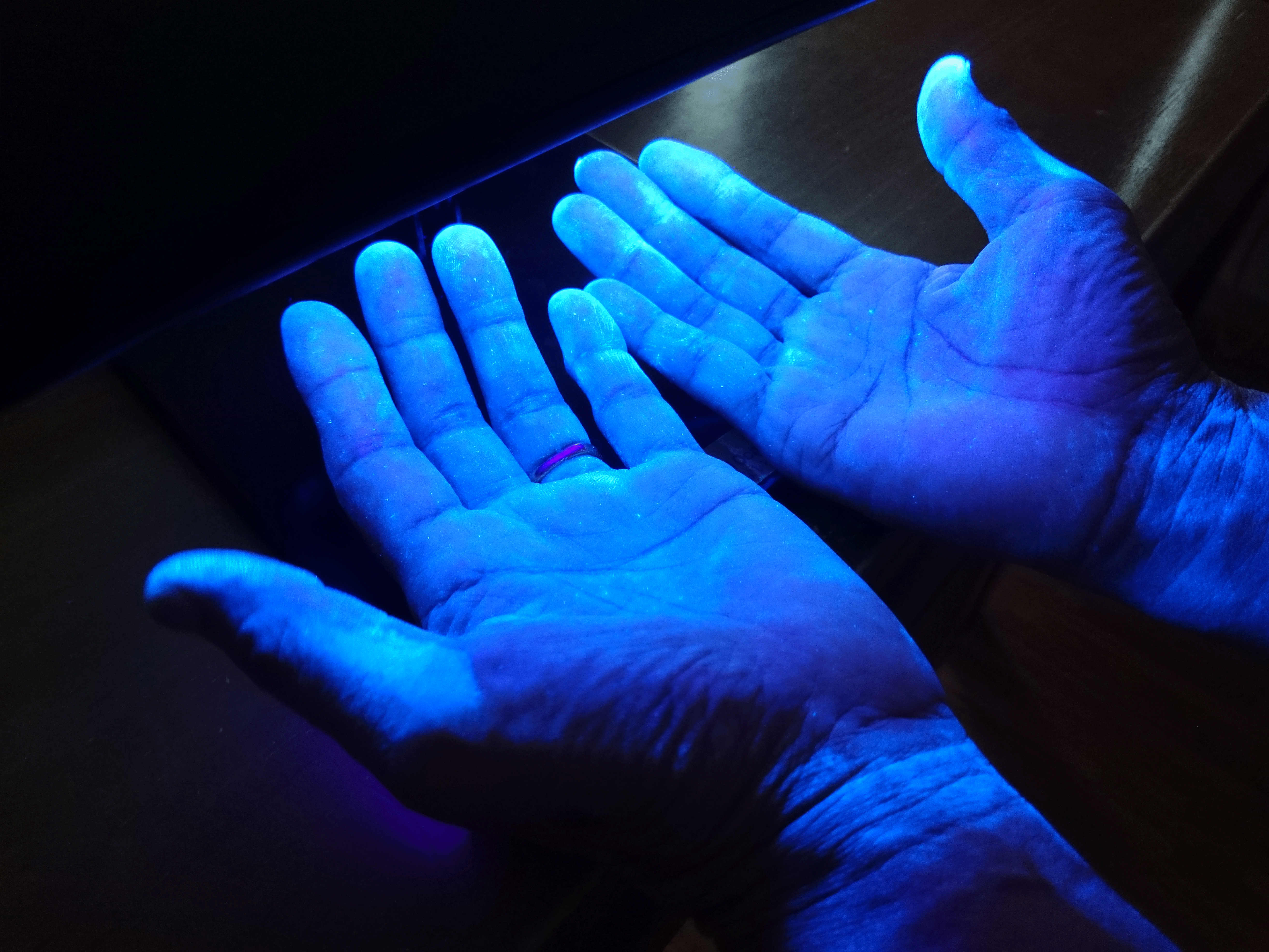 (※クリームの中に発光剤が含まれていて、洗い残しの部分をブラックライトにあてると白く光る仕組みです。)
