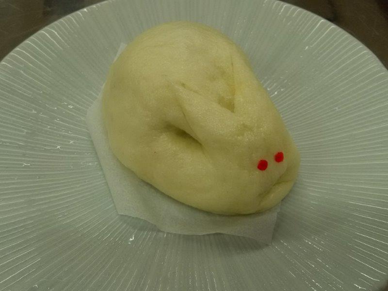"うさぎ饅頭"は丸めたり、蒸したりとしたあとに、赤い食紅で、ちょんと目をいれて完成です☆彡