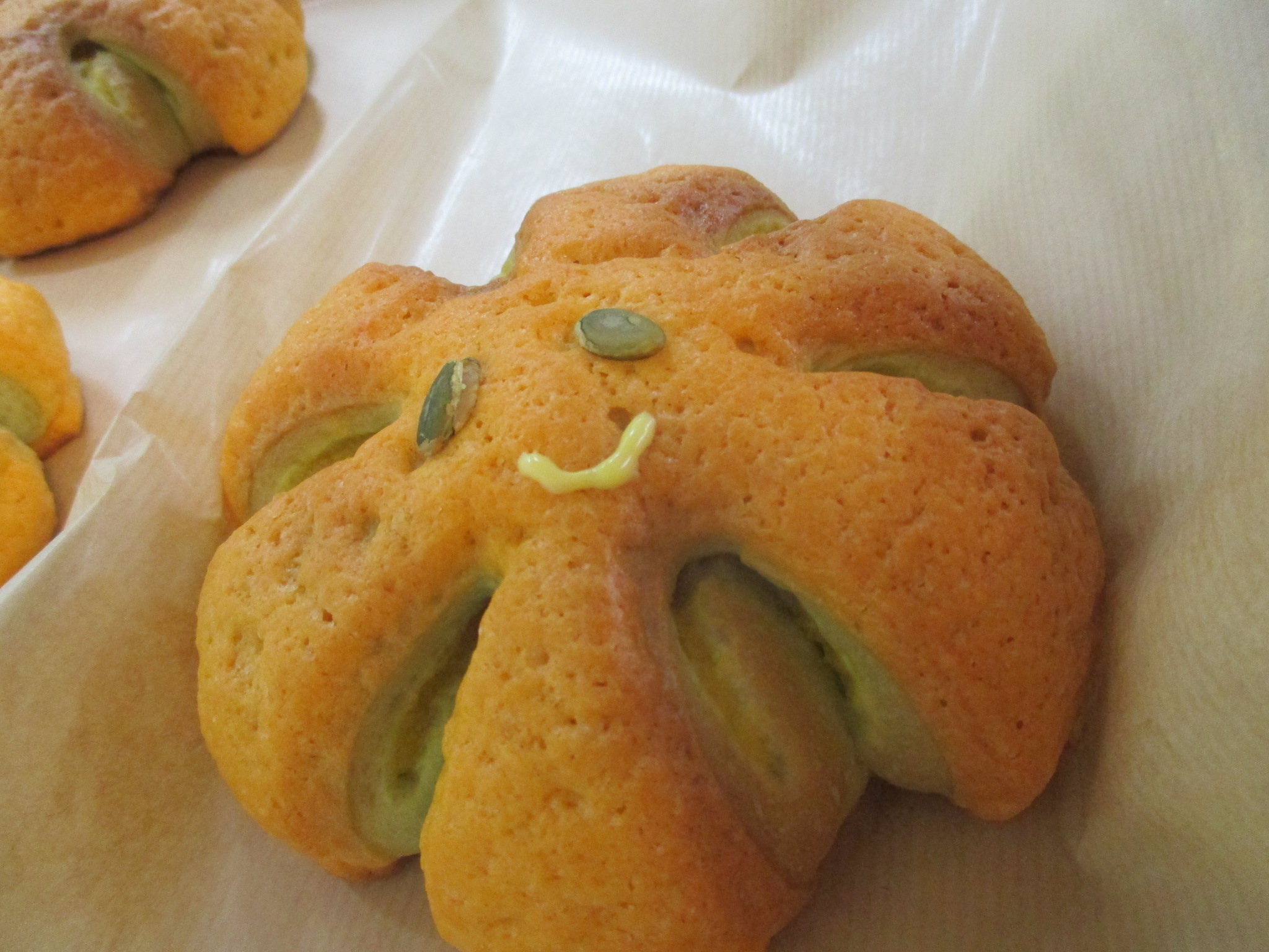北海道産、えびすかぼちゃを使用したクリームを包んみ、オレンジの生地をのせたメロンパンです!かぼちゃの種がかわいく飾りつけられています!!