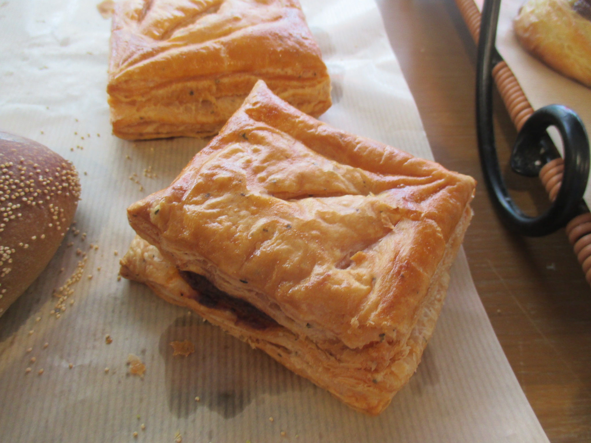 トマトパウダーとバジル入りのパイ生地にマカロニを包んだ惣菜パンです!