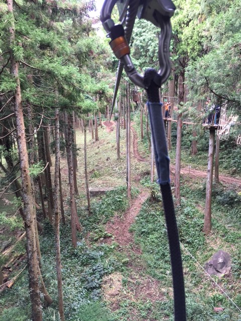 だんだん高さにも慣れてきた中盤のアスレチックです。箱根湯本のアスレチックの中で、一番長いジップスライド!ターザンのようにロープを滑ります!途中で体勢が変わってしまい、ゴールすると泥だらけになります...利用される8割の方が背中から着地してしまうそうで、むしろ正面を向いて着地出来る方の方が少ないんだとか・・・