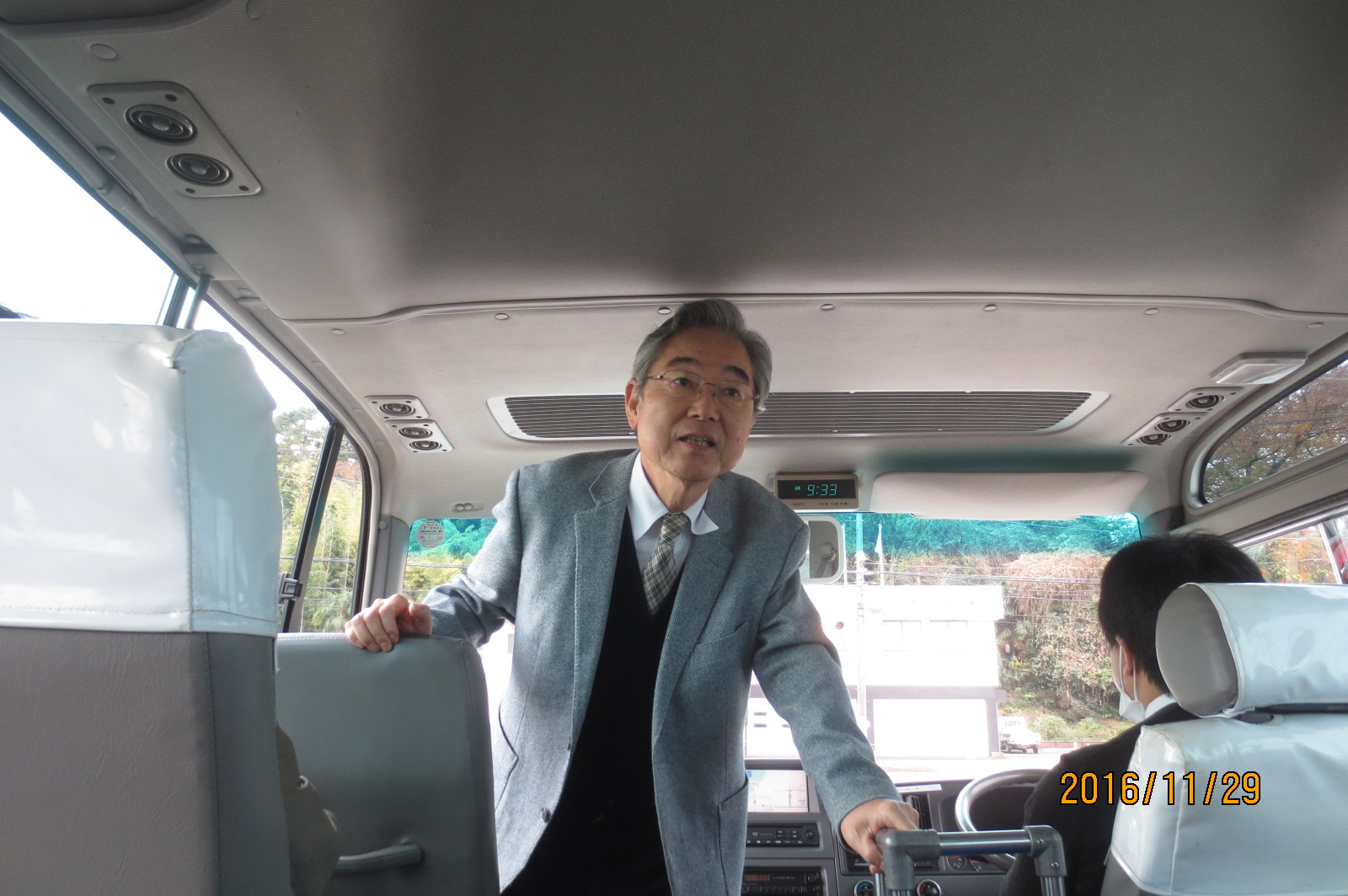 バスの中で理事長石川より、"進和学園"の歴史や本日見学予定の"はばたき進和"について紹介しました。