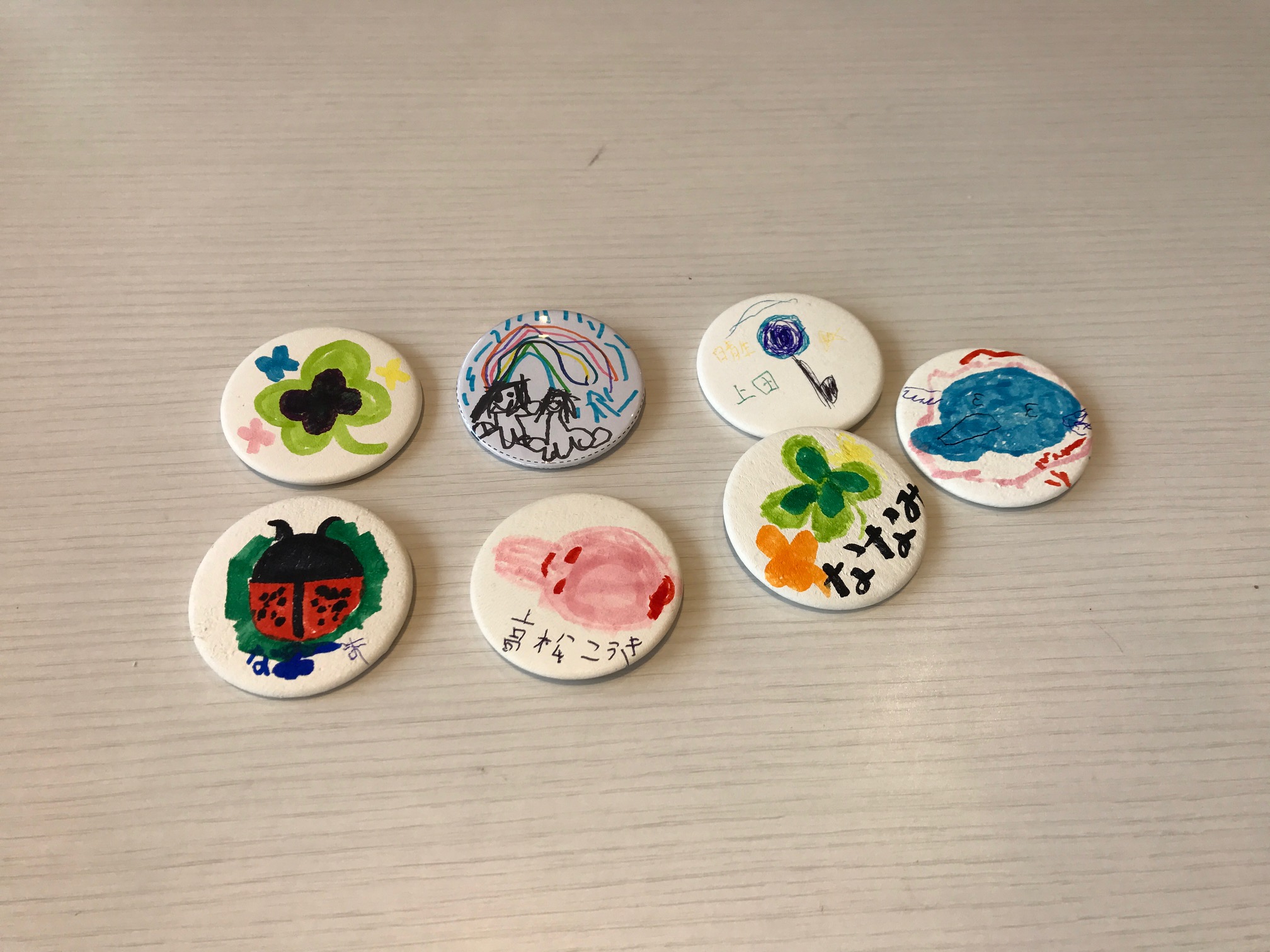 チラシを見て、近隣の小学校や幼稚園に通うお子さんたちが集まってくれました。鹿革を丸く切り抜き、缶バッチを作りますが、いつもより素材が厚手なので、慎重に機械を扱わないと失敗してしまいます。お子さんたちが、一つ一つ「うまくできますように」とおまじないをかけながら、楽しく作り上げました。丸い鹿革の上に好きな絵を画いて、ちょっと贅沢なオリジナル鹿革缶バッチが出来上がりました。