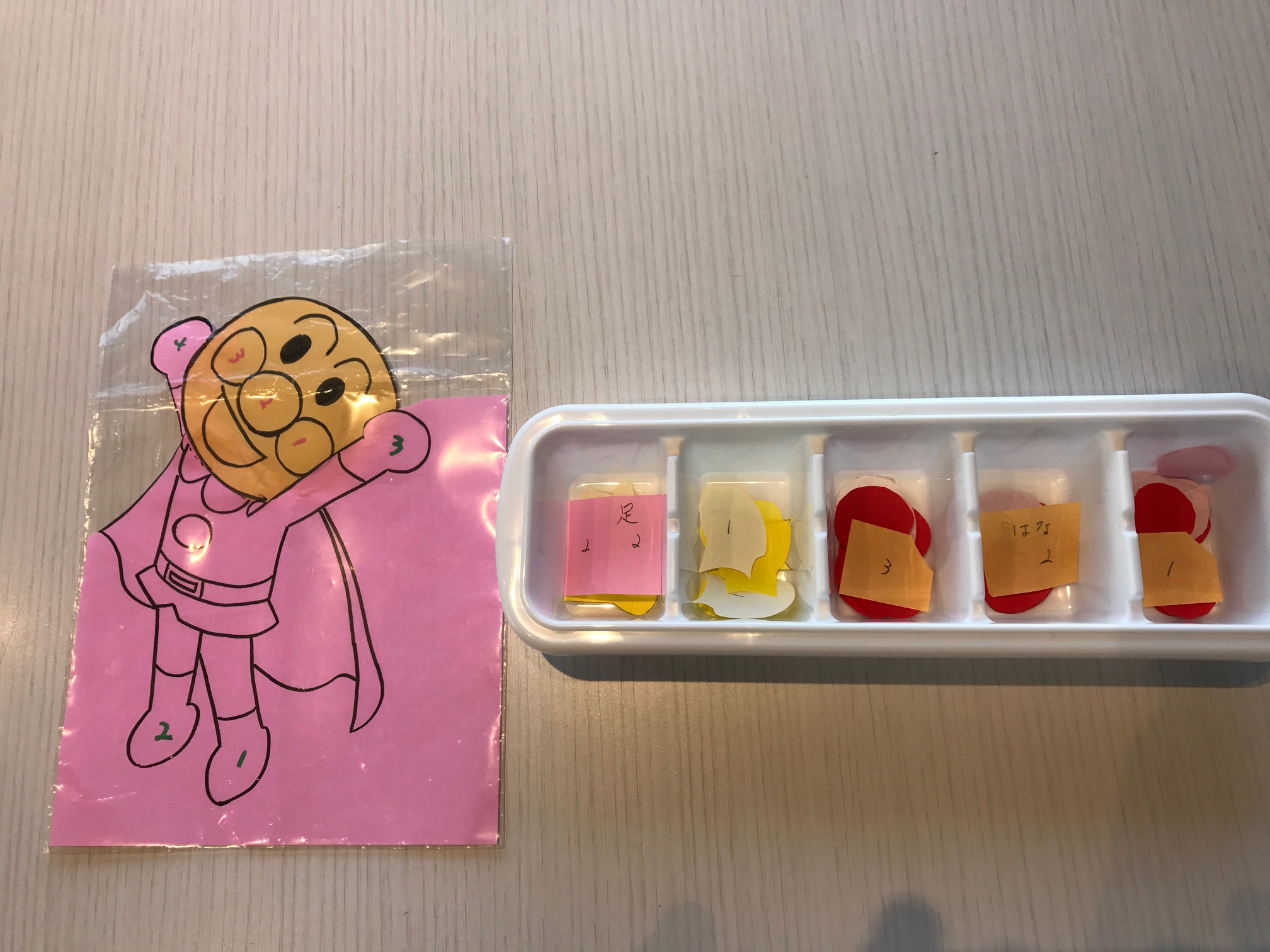 「ここは子どもさんが多いからアンパンマンがいいわね」とオリジナルで作ったアンパンマンの切り絵セットをもって来てくれました。アンパンマンの顔や胴体や足を細かいパーツに分けて、小さい切り絵の材料がそろっています。