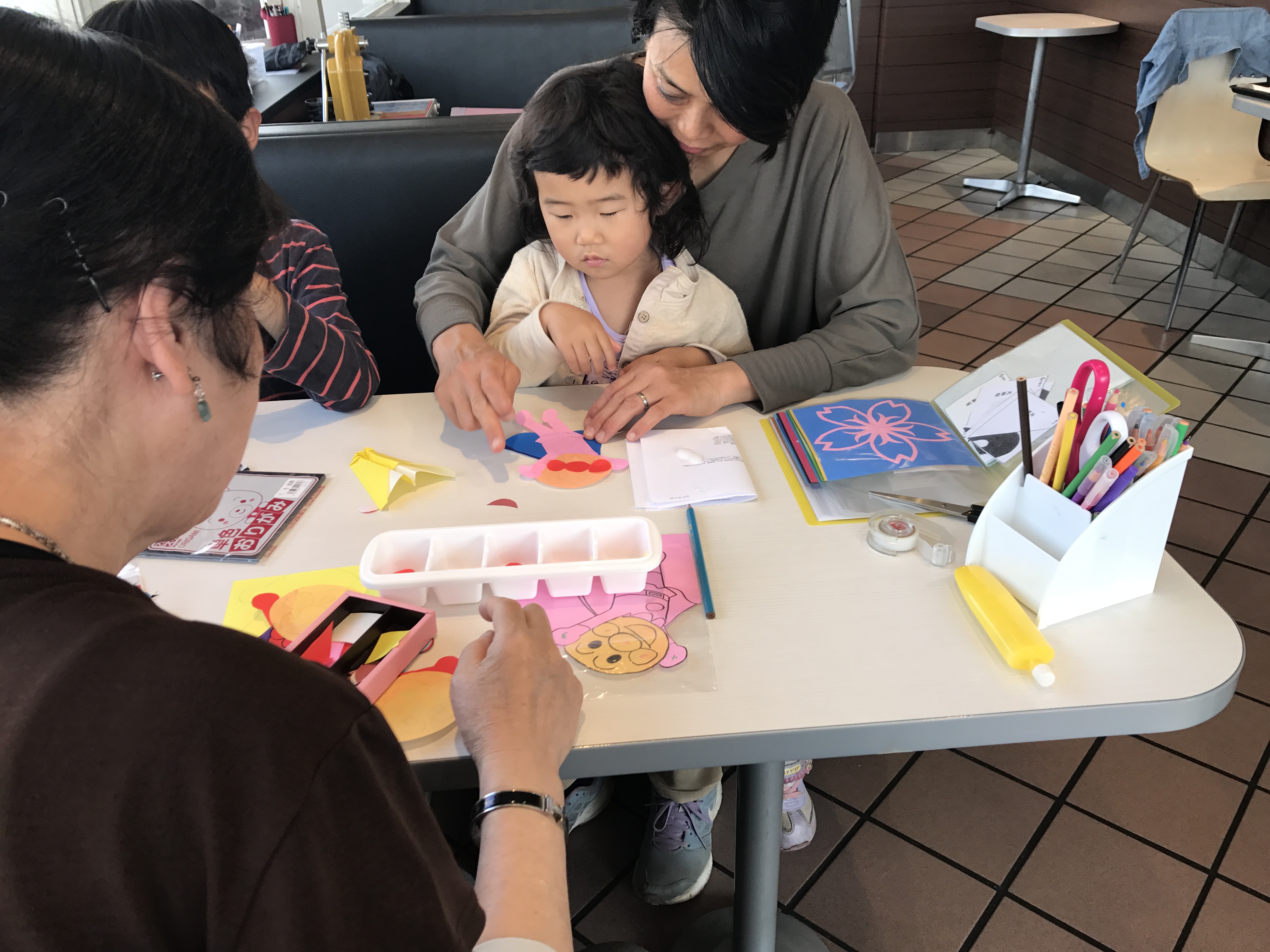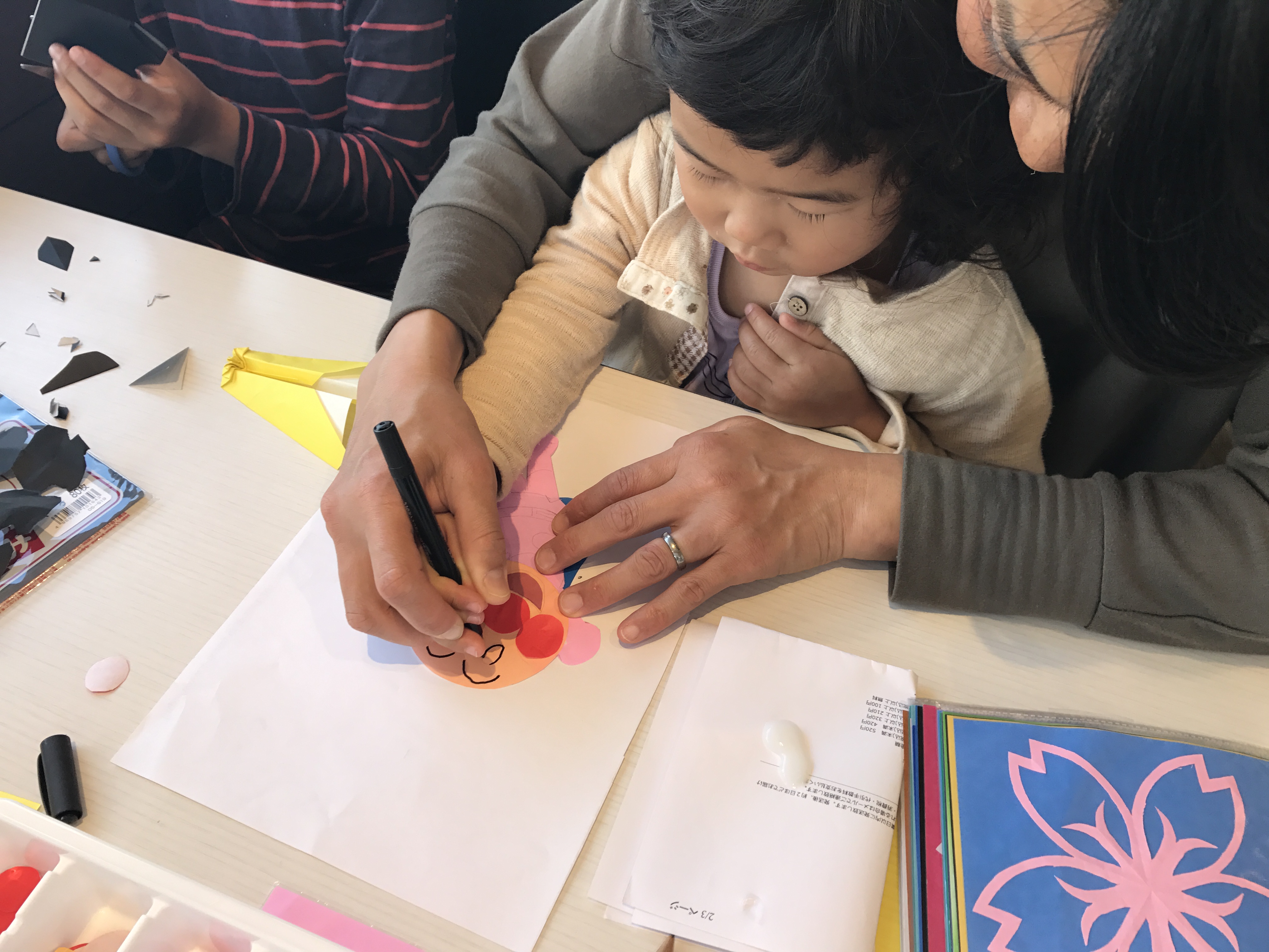3時すぎ、常連のご一家が来てくれました。いつもは4年生のお兄さんが回り将棋などを楽しんでいくのですが、今日は下のお嬢さんがアンパンマンの切り絵に挑戦することにしました。お母さんに手を添えて手伝ってもらい、Kさんが対面でていねいに作り方を説明して、見事にかわいいアンパンマンが出来上がりました。