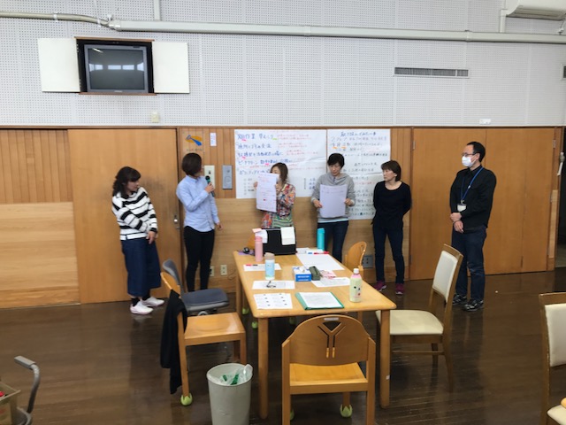 終了後に振り返ると、利用者本人のための面談なのに、父母に向かってばかり話していることに気づいたり、本人役は職員をみても職員は父母をみて話しておりさみしい気持ちになったりなど、他にも面談の準備の重要性や、面談にのぞむ父母の緊張感や、利用者本人の前では相談できない気持ちにあるなど、普段あまり気づくことのできないことに気づき、職員で共有することができる時間となりました。