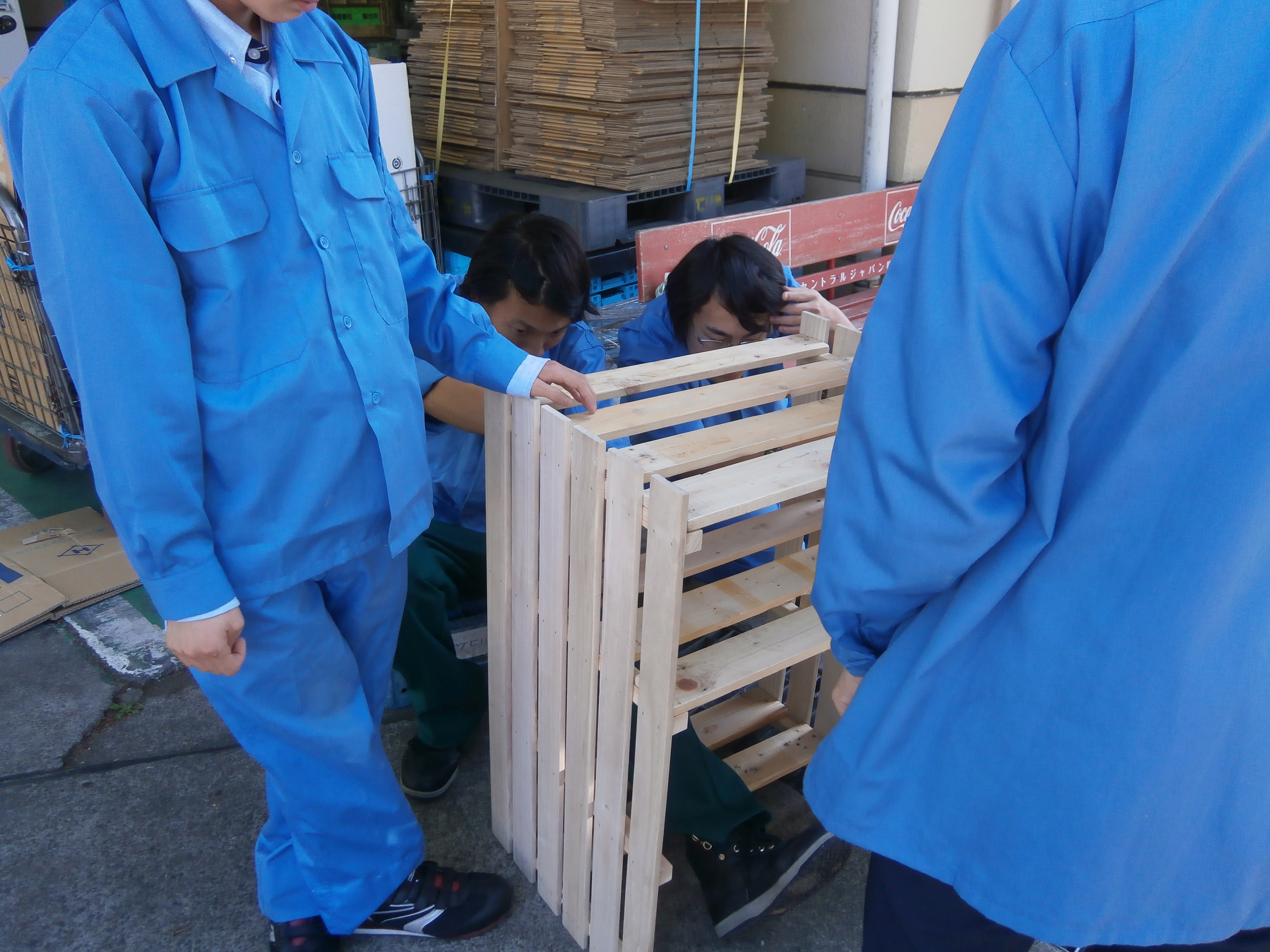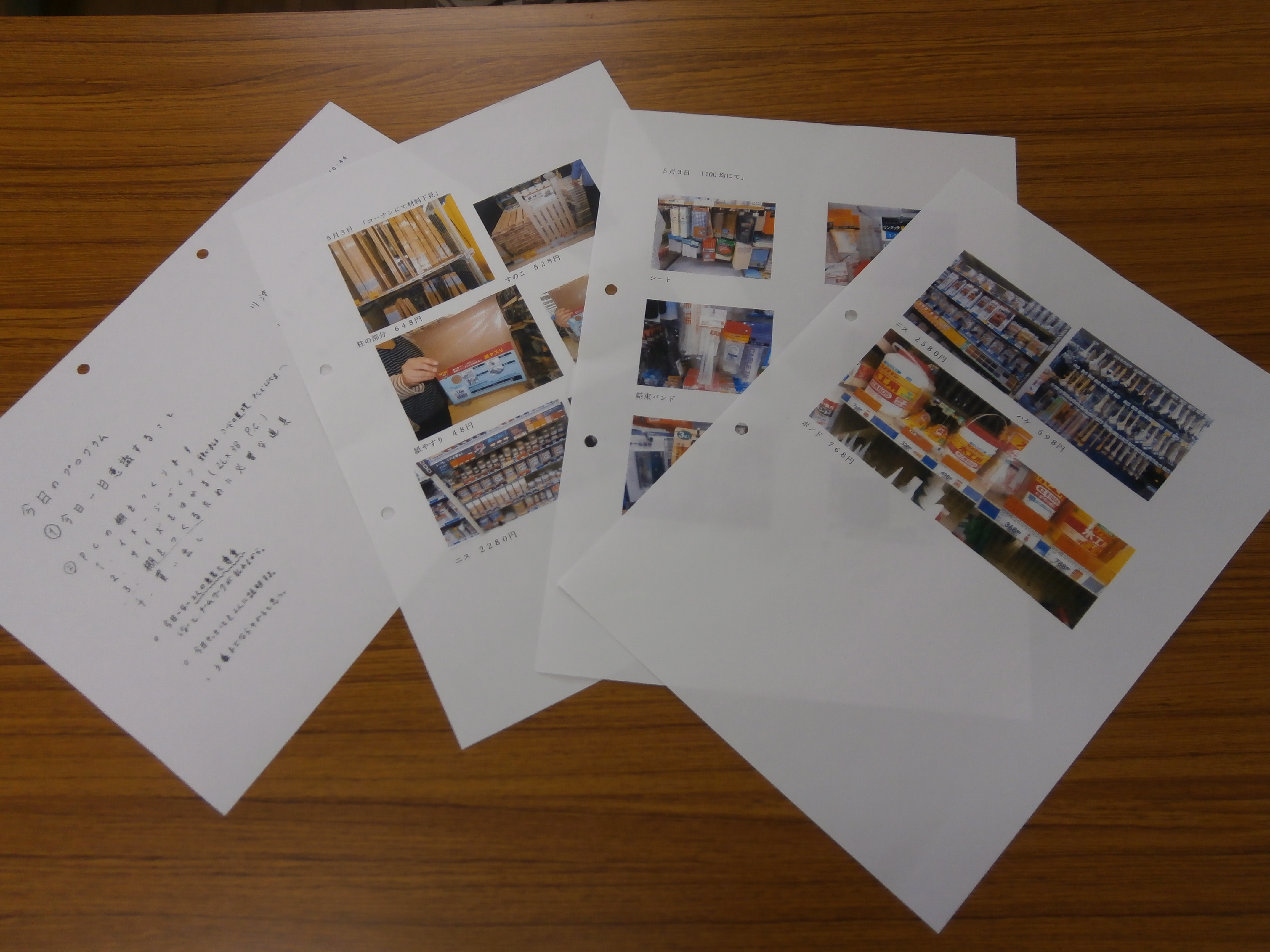 就労移行の社員に「棚を買ってくるか」「自分たちで作るか」を考えてもらうと、「作りたい!」ということだったので、自分たちで、インターネットを使い、どんな棚があるのか調べ、棚のイメージを作り、必要な道具調べ、コーナンに下調べ。調べた物をデジカメで写真を撮影し、パソコンで一覧をつくりました。必要な道具をみんなで検討し、