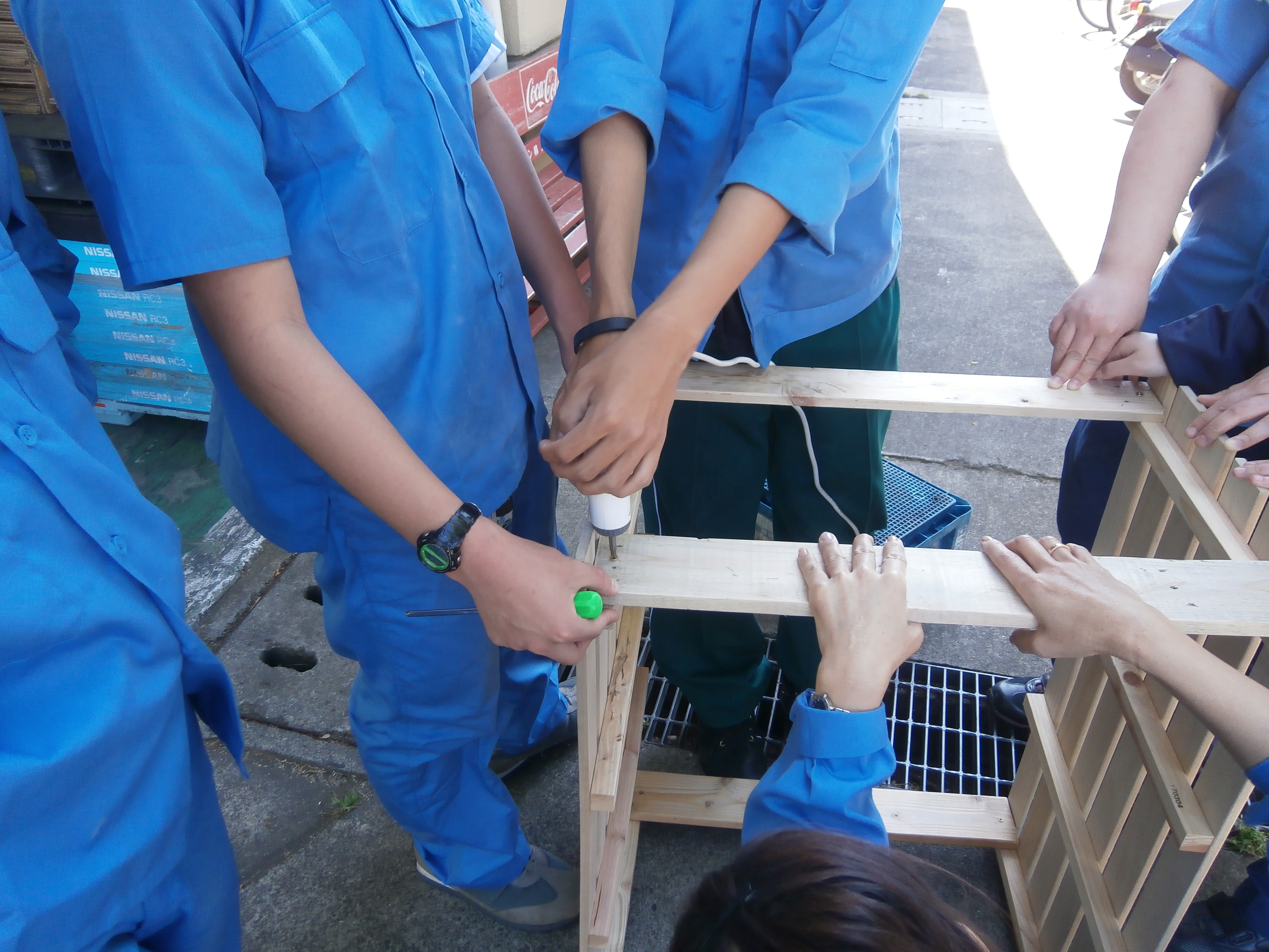 ◆みんなで木材の表面をヤスリで削り、協力して組み立てました。