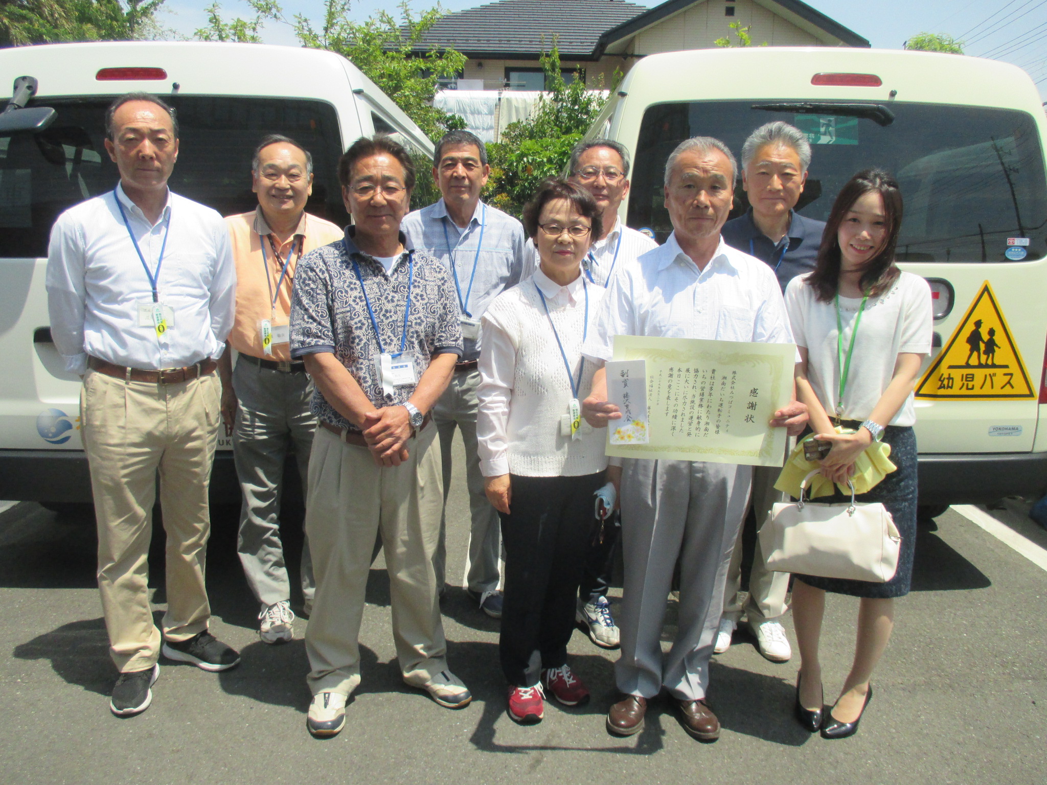 今回、送迎業務を委託している(株)みつばコミュニティ運転手の皆さんに、送迎業務だけではなく、湘南だいちの営繕業務も積極的に従事し、多大な貢献をしていただいていることを、湘南だいちから法人表彰として法人に推薦しました。