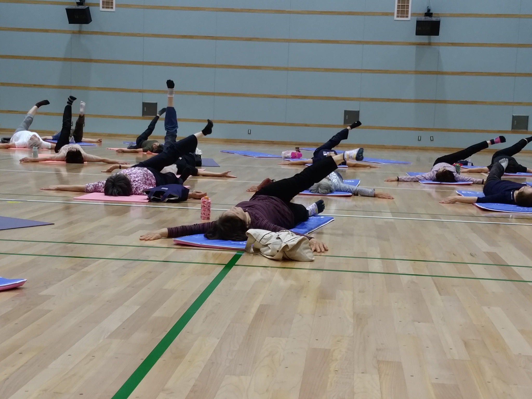 優しい音楽と先生の声の中で身体を伸ばして
