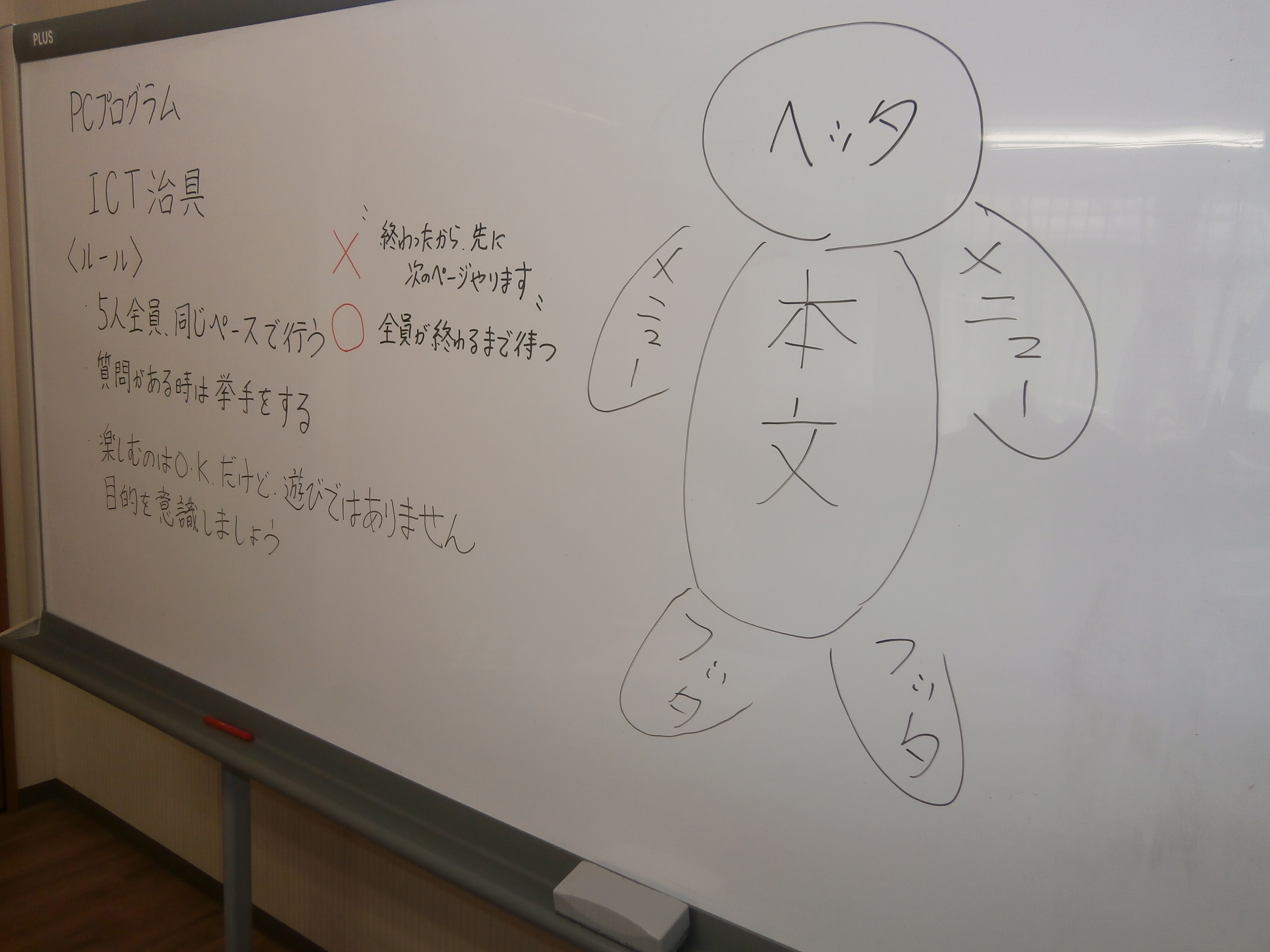そして6月1日(木)に移行支援事業のメンバーが使う各々のパソコンにこのソフトが導入されました。最初に、実在するホームページを閲覧して今後作成に当たるホームページがどういうものであるかというイメージを持ってもらうとともに、ホームページの構成要素について簡単に説明を行いました。その後、実際にICT治具に触れてみることにしました。この日は導入初日ということもあり、テキストに記載されたモデルのホームページ作成してみることにしました。このソフトの最大のウリでもある、"テキストに従えば、ホームページを作ることができる仕組み"を活かし、各自作成に臨みました。職員がテキストに記載された指示内容を読み上げ、メンバーはそれに従って操作を進めました。パソコン操作にはメンバー間で差はあるものの、操作をしているうちに自分たちが何に取り組んでいて、何ができあがるのか?ということに徐々に実感が持てている様子でした。