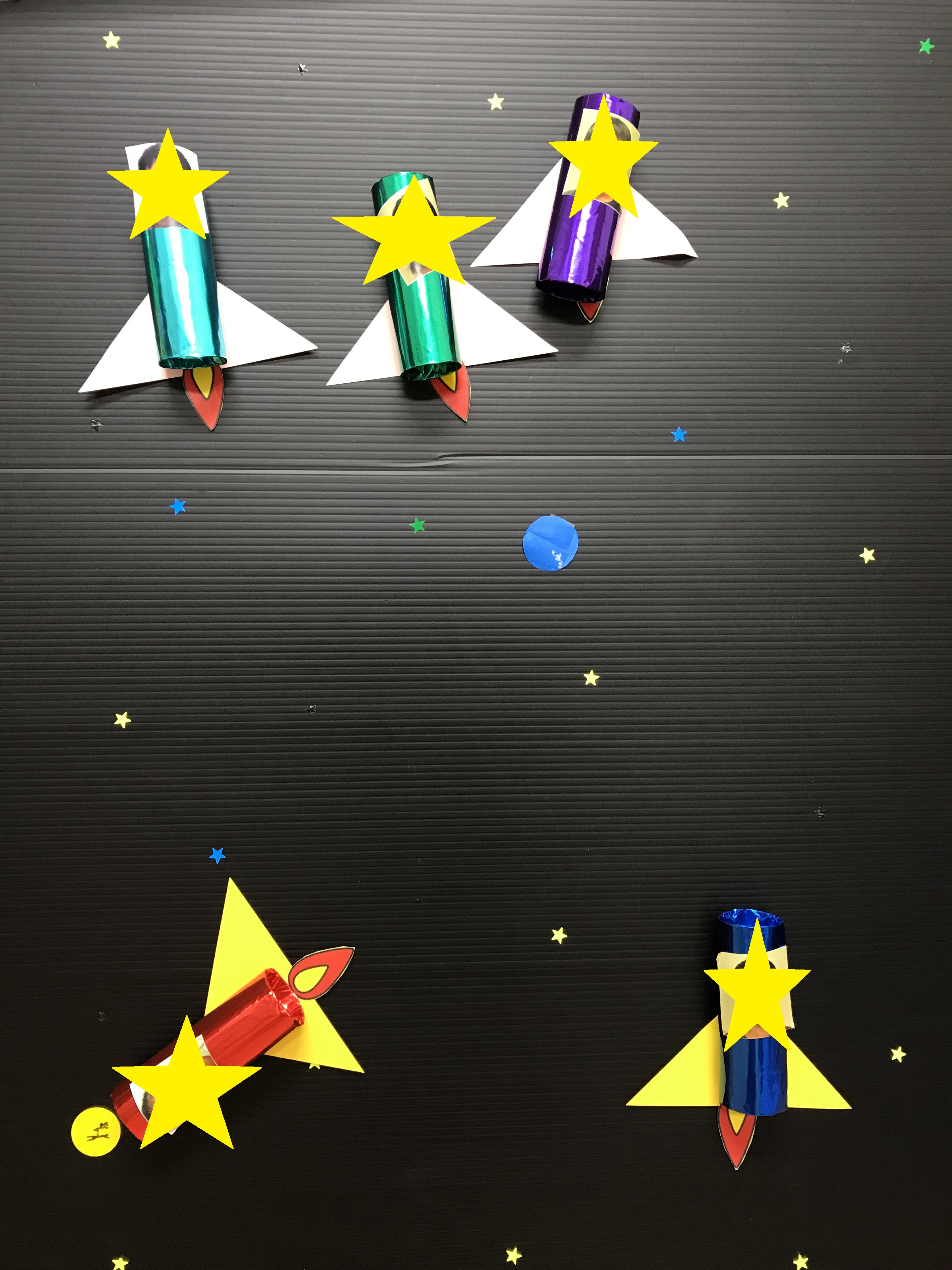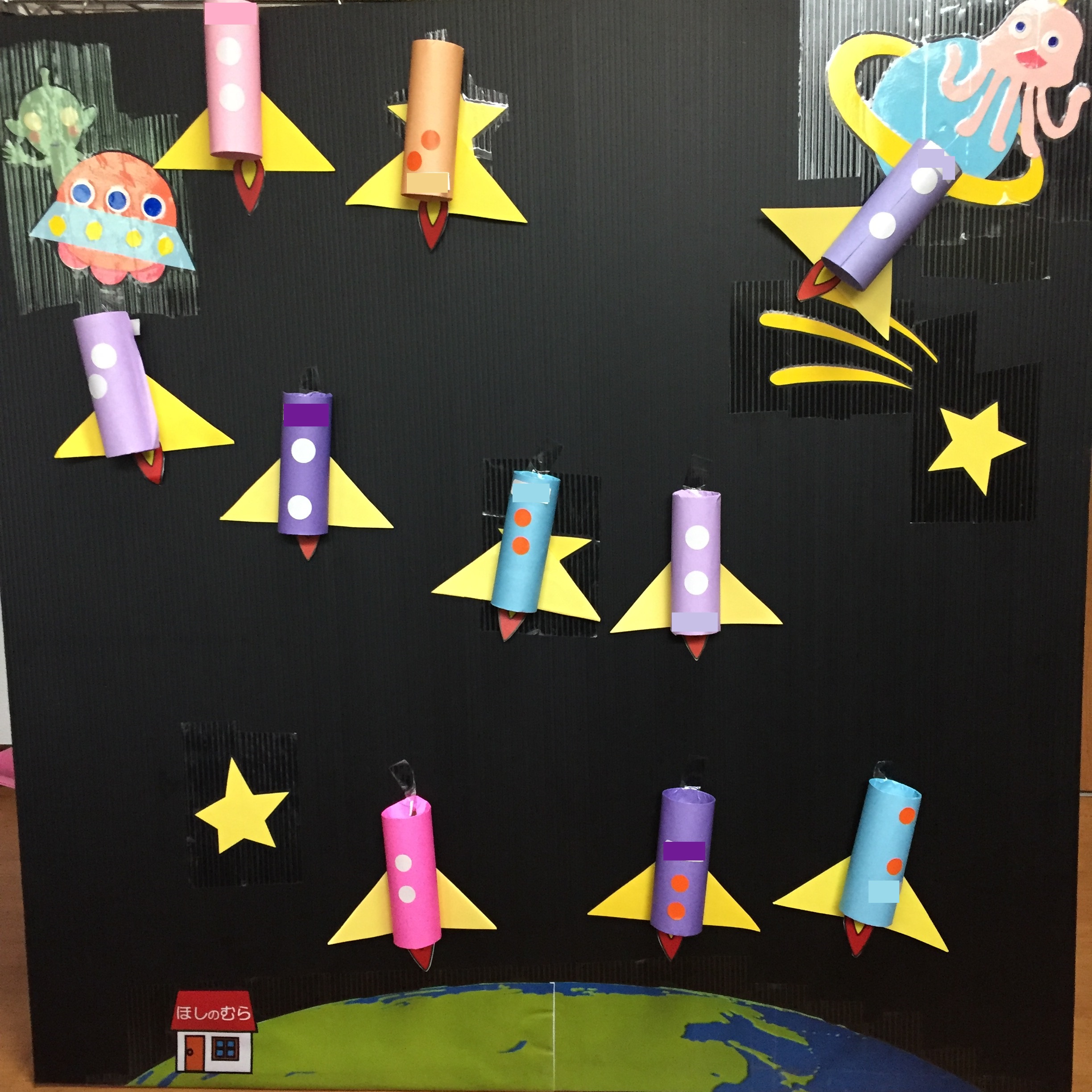 カラフルでは、子ども達がロケットの窓から外を覗いているような作りや胴体の色を10種類のキラキラ折り紙から選んでもらうように工夫すると、折り紙同様に目もキラキラさせながら楽しそうに選んでくれました。