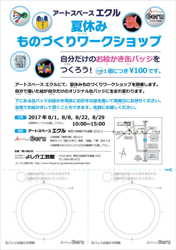 「夏休みものづくりワークショップ」として7月1日のSFC七夕祭でも90名の子供たちが参加してくれて大好評だったオリジナル缶バッジづくりのワークショップをアートスペースエクルで開催します。
