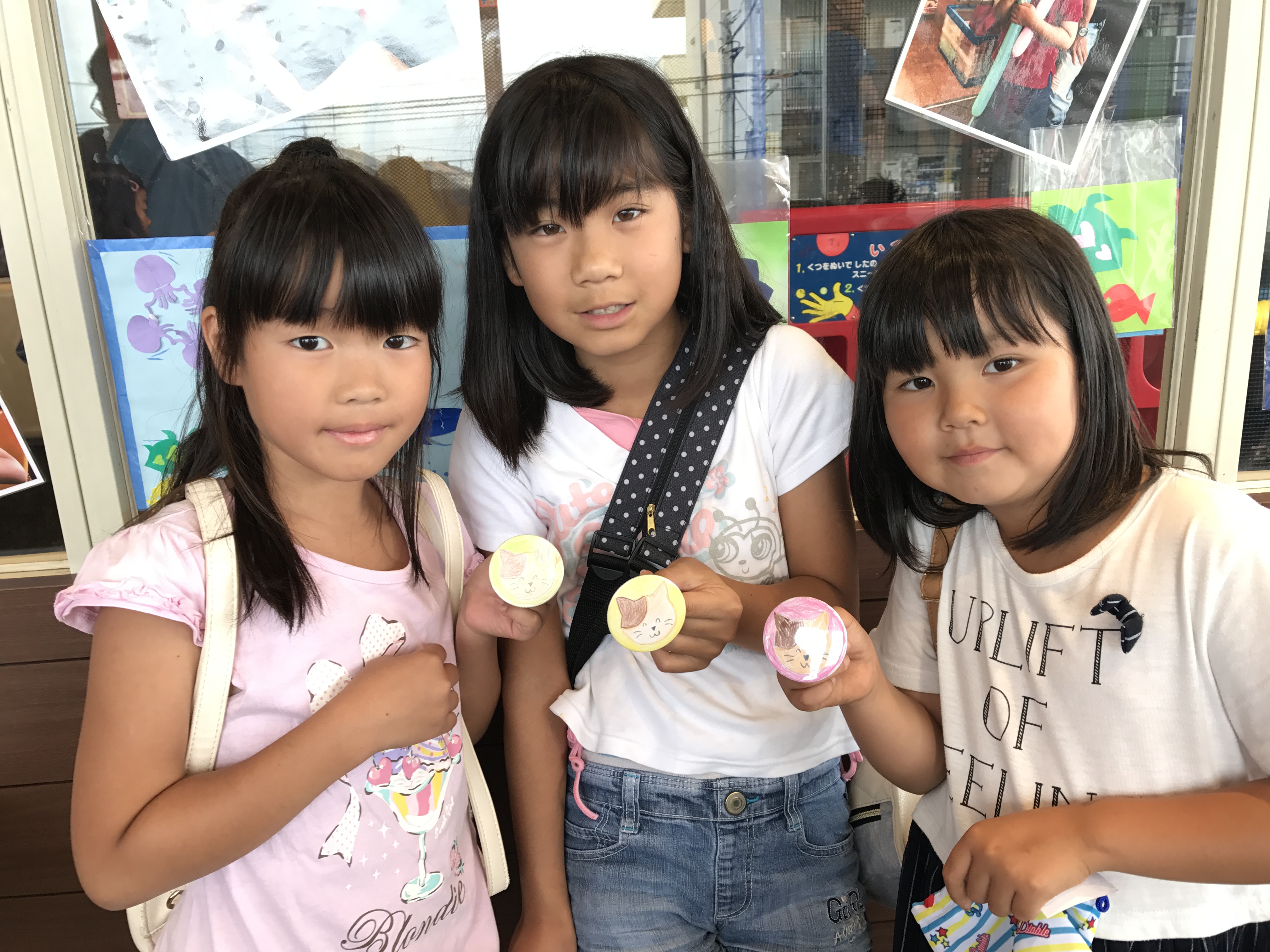 ▼小学生の3人組が同じネコのデザインのぬり絵をそれぞれ作ってくれました。同じネコでもぬり方で全然違ってみえるのが、ぬり絵缶バッチの楽しみです。