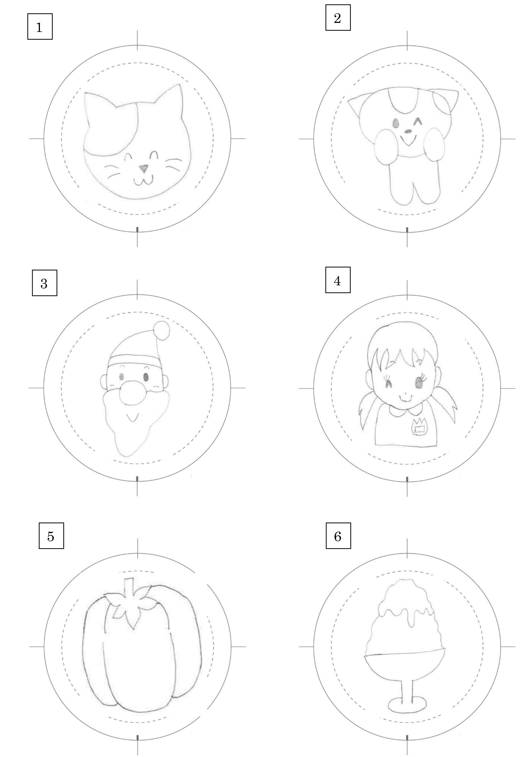 山本さんのオリジナルデザインのイラストを、缶バッチの大きさの線画による12枚のぬり絵に仕立てました。