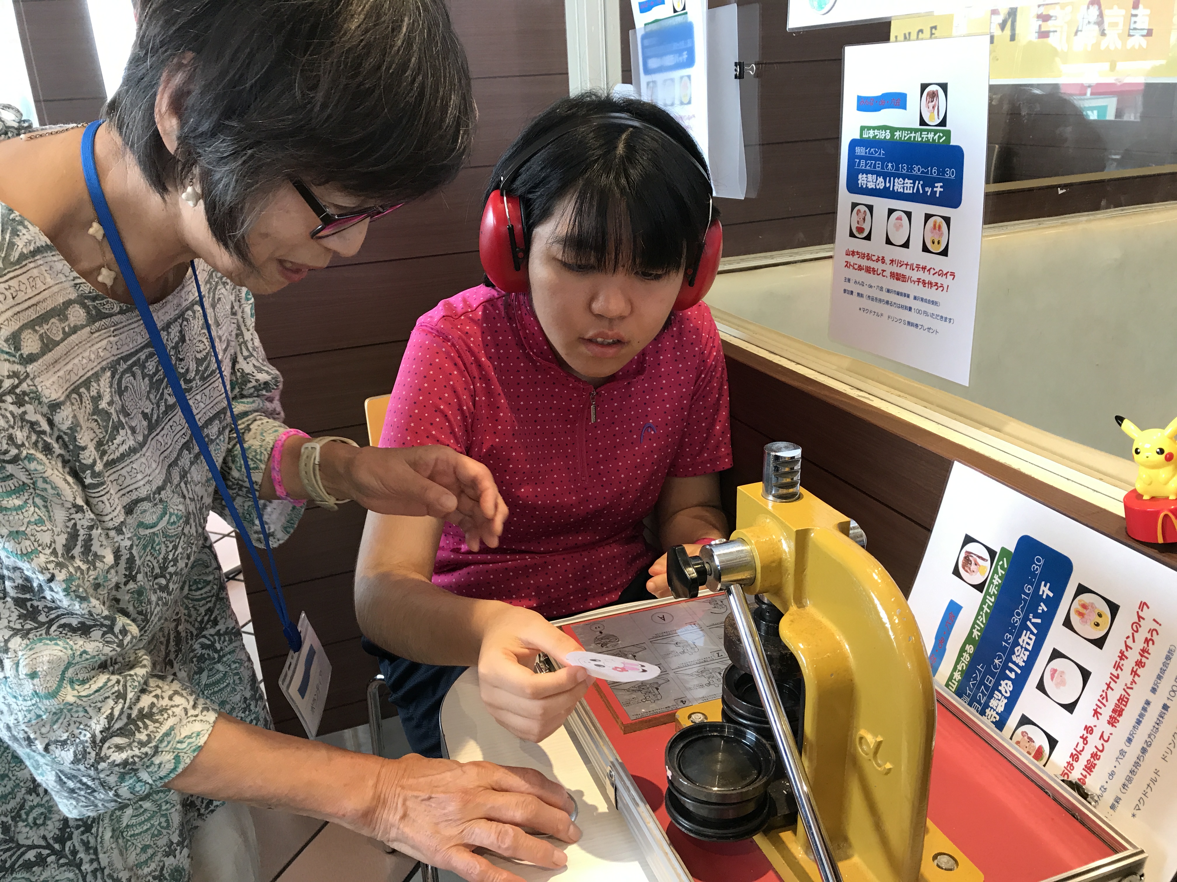7月27日、『山本ちはるオリジナルデザインによる特製缶バッチ』の特別イベントを開催しました。山本ちはるって聞いたことないけど、デザイナーの人?そう、今売り出し中の新進デザイナーです。普段は、当法人の湘南だいちに通っていますが、その絵画のセンスは群を抜いています。湘南だいちの職員の方たちと相談して、「山本ちはるさんをデザイナーとしてデビューさせようと」企画が決まりました。
