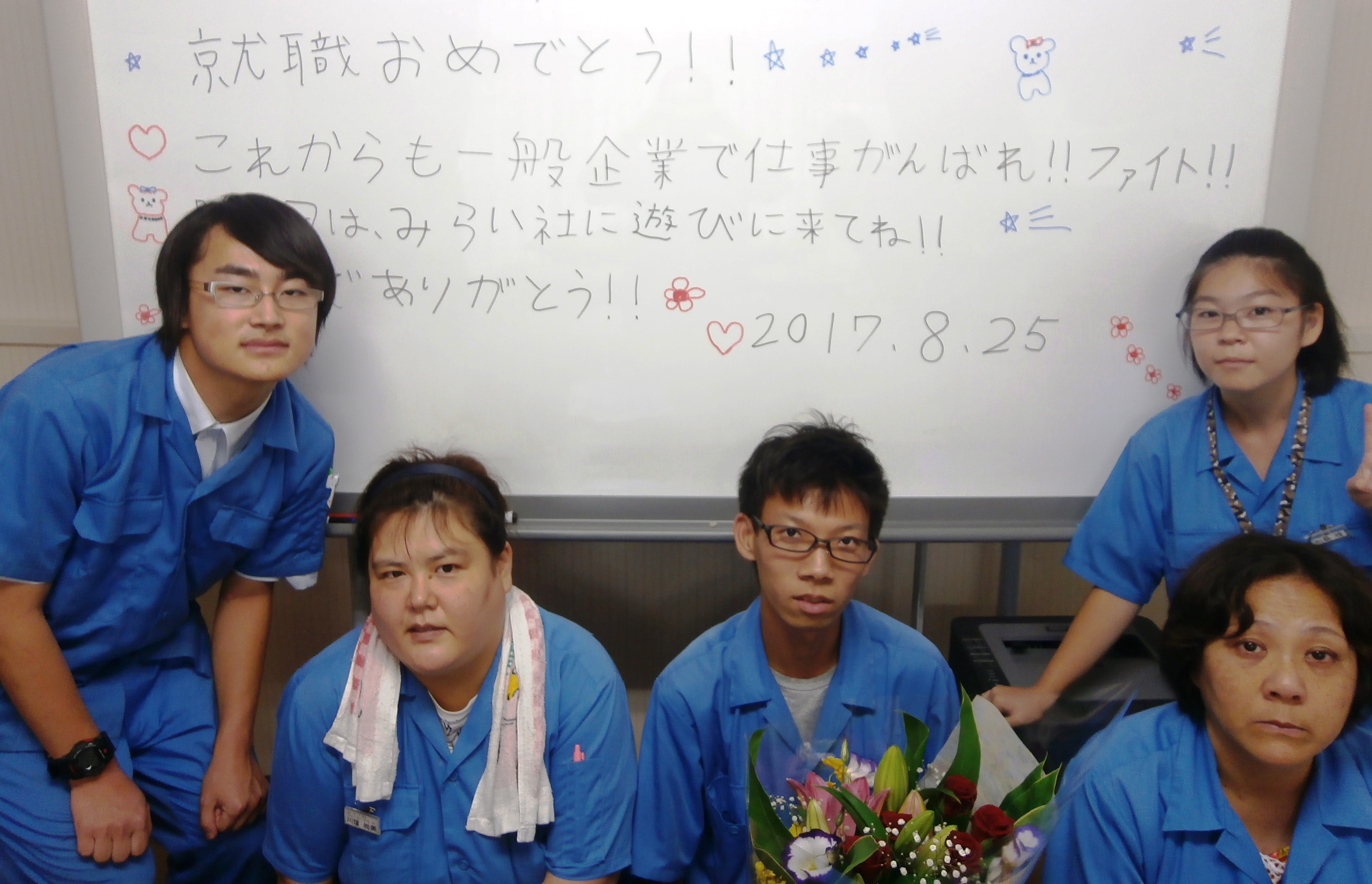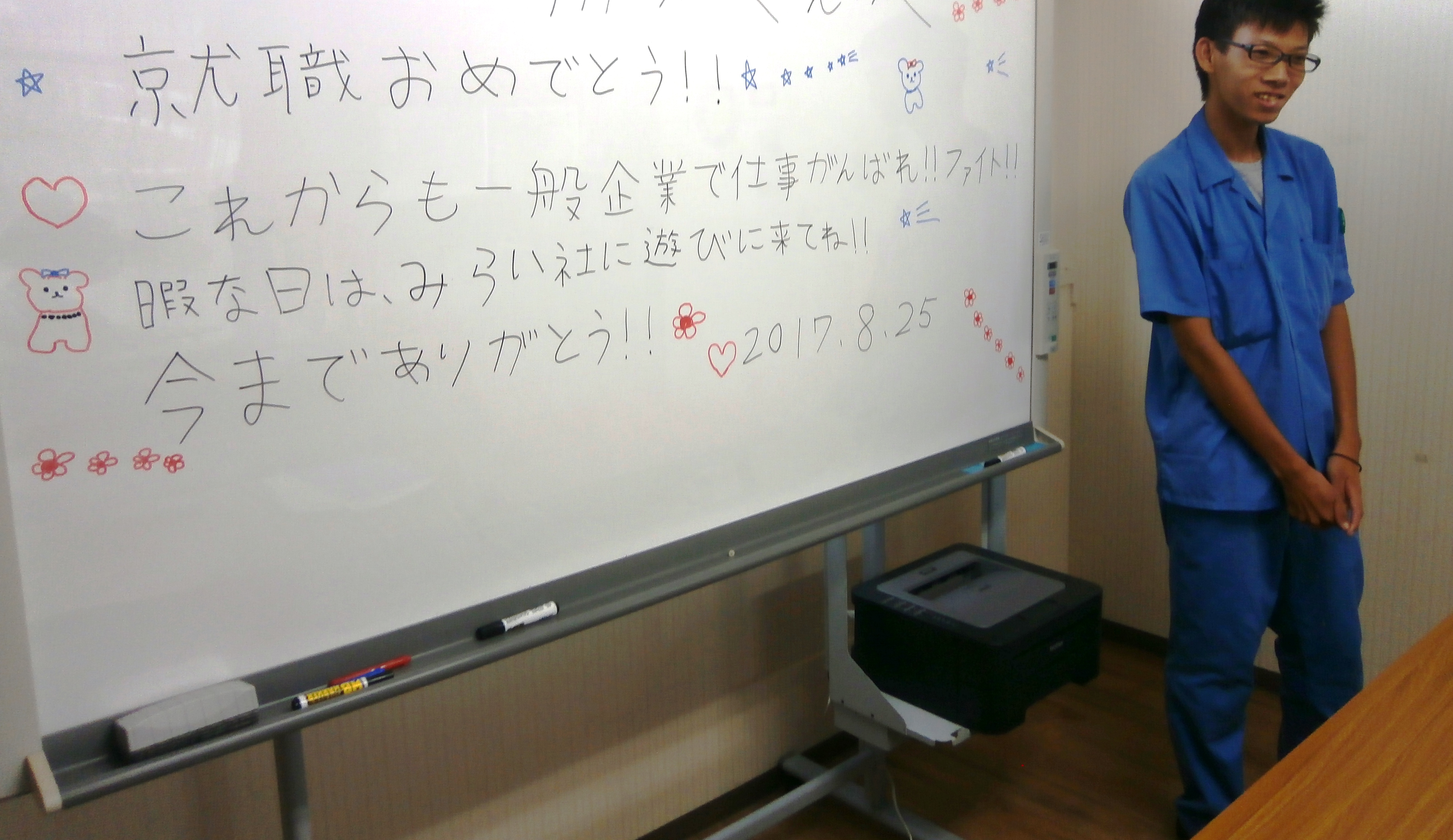 先日、就労移行支援事業のメンバーの一人の大和田さんが就職することになり、みらい社を"卒業"することになりました。8月25日(金)がみらい社を利用する最終日だったのですが、その際、大和田さん以外の就労移行メンバーから心温まる粋な計らいがありましたので、報告したいと思います。